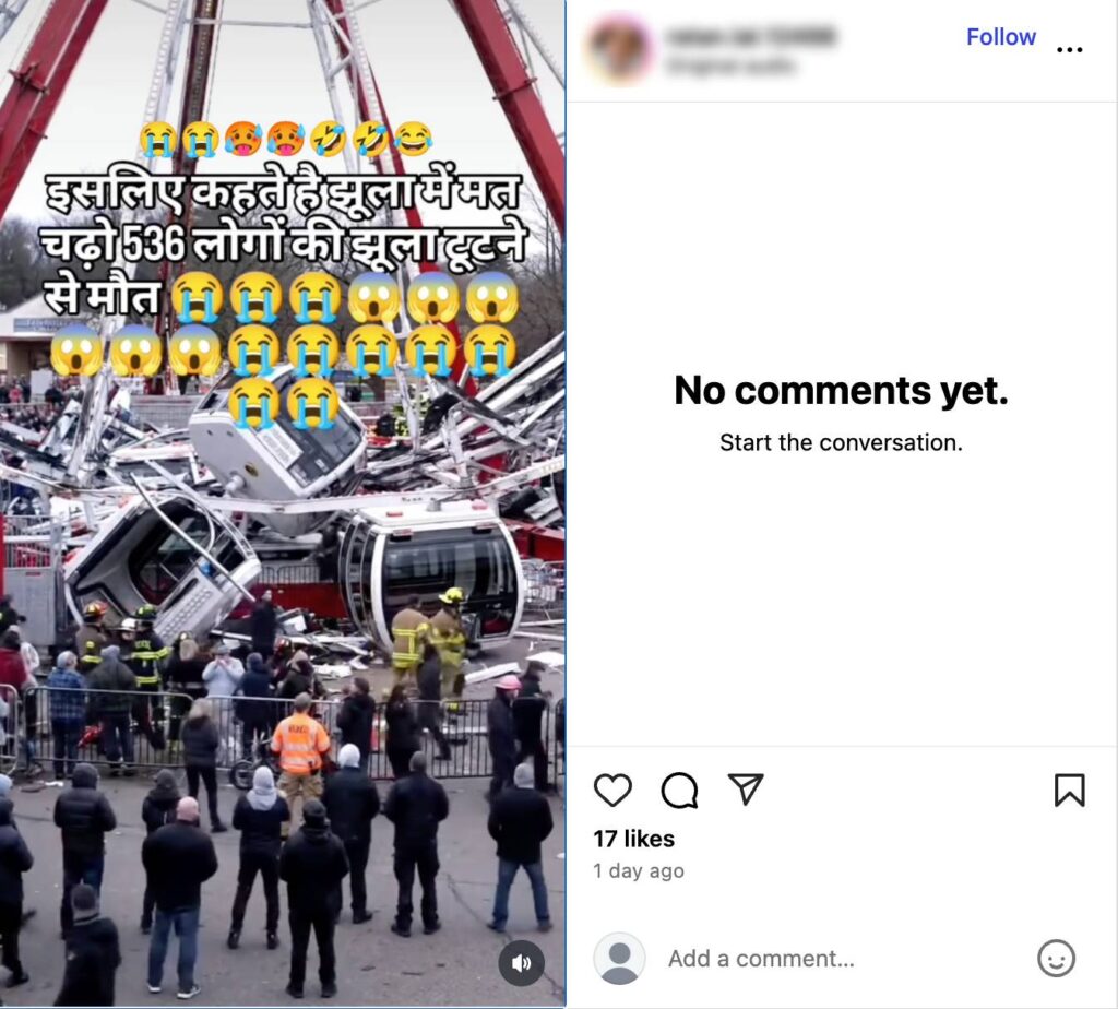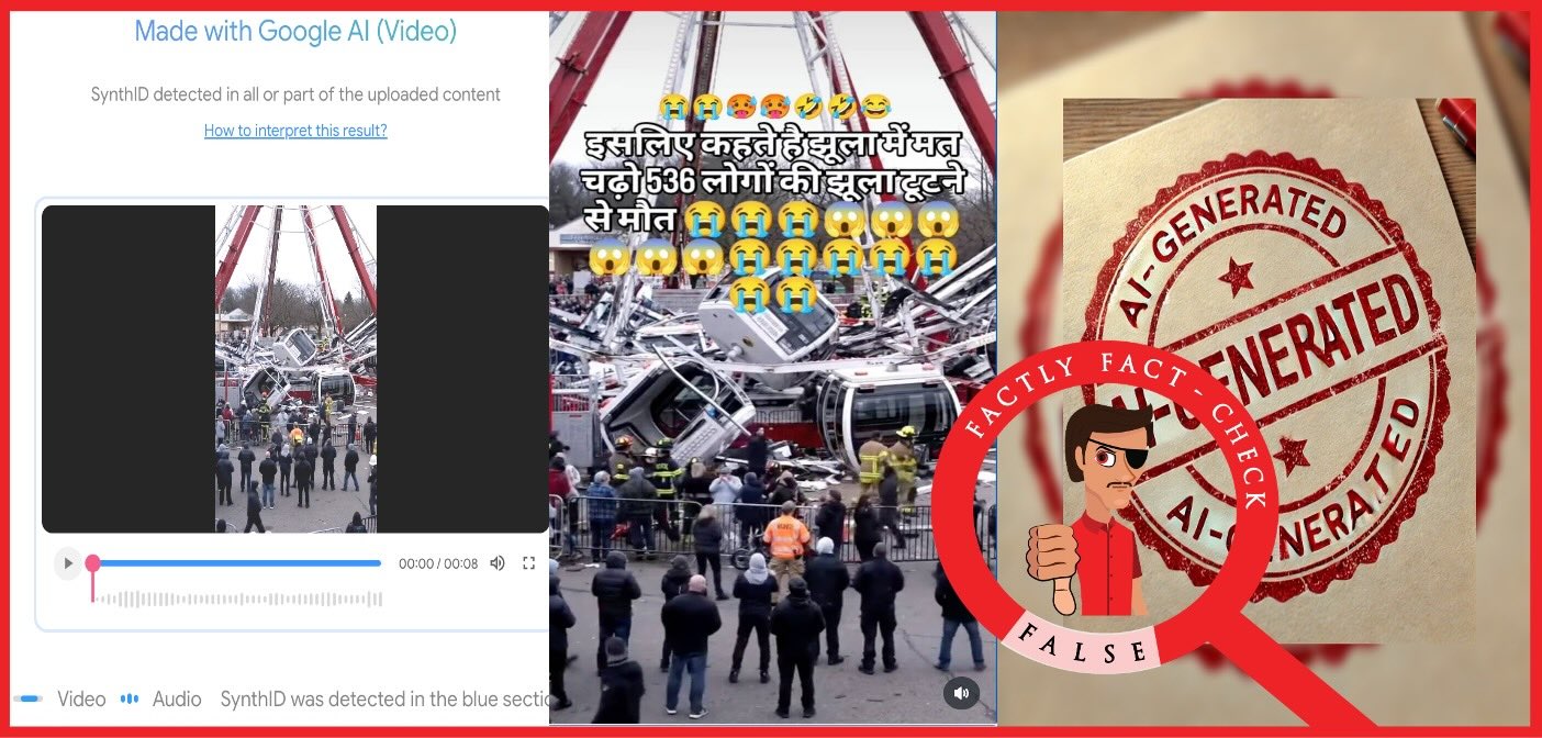 A purported video showing a collapsed amusement park ride (Giant Wheel/Ferris Wheel) is going viral on social media (here, here, here, here, and here). Many users are sharing this clip, claiming that it depicts a real incident in which 536 people lost their lives. Some posts (here, here) further allege that the video shows an amusement park ride collapse in Europe, reportedly killing 8 Indians and 12 others. In this article, we fact-check the claims made in these posts.