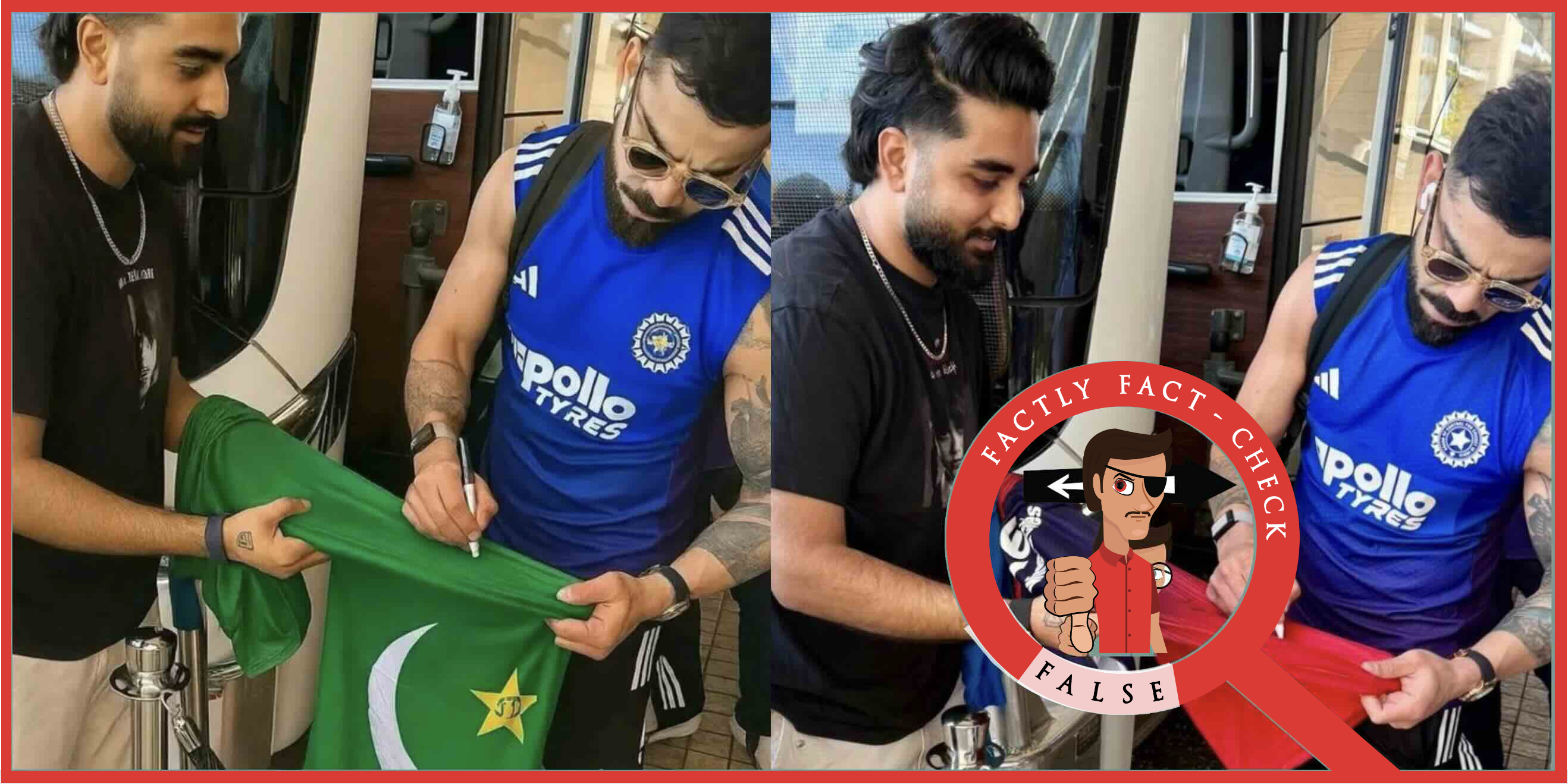 Fact: The original photo shows Virat Kohli signing a Royal Challengers Bengaluru (RCB) jersey for a fan. The viral image is edited to make it appear as if he was signing a Pakistan jersey. There is no Pakistani flag or jersey in the original visuals. Hence the claim is False.