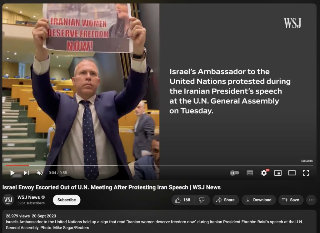 As per the news reports (here, here, and here), Israel’s ambassador, Gilad Erdan, displayed a poster that reads, “Iranian Women Deserve Freedom Now!” in the UN General Assembly.