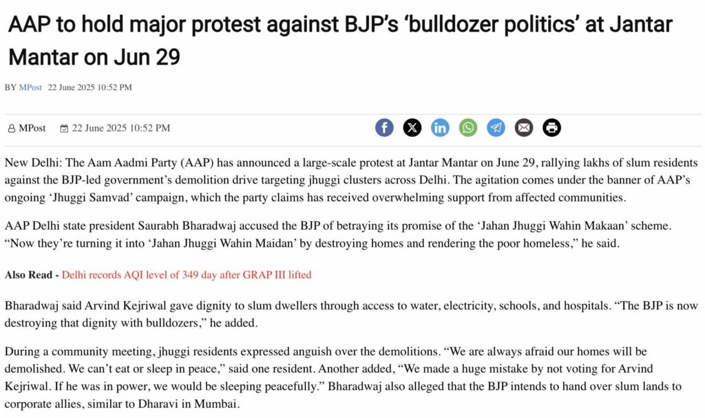 Further search led us to several news reports (here and here) about the AAP protest held at Jantar Mantar on 29 June 2025 against the BJP’s bulldozer actions across India.