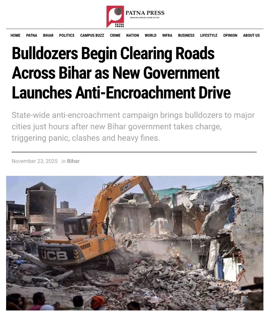 A keyword search regarding the government’s bulldozer action in Bihar after the formation of the new government led us to multiple news reports (here, here, here and here). These reports state that anti-encroachment drives have begun across the state. Joint teams of the police and administration carried out operations in Patna, Motihari, and Danapur using bulldozers and cranes. Similar actions are also underway in cities such as Samastipur, Sitamarhi, Bhagalpur, Muzaffarpur, Danapur, Lakhisarai, and Bihar Sharif, where both temporary and permanent illegal structures are being removed. However, the viral video is unrelated to these encroachment drives.