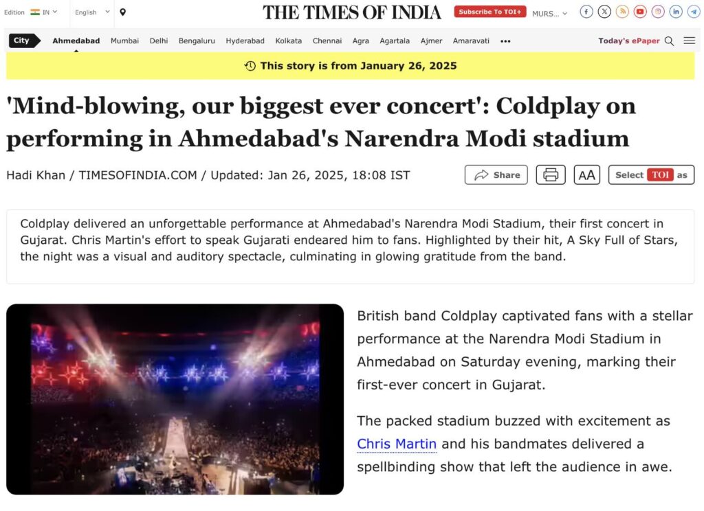 We also found several news reports (here, here and here) confirming that a Coldplay concert was held on 26 January 2025 at the Narendra Modi Stadium in Ahmedabad. These reports clearly establish that the viral video is from that concert and has no connection to Lionel Messi’s GOAT India Tour, which took place in December 2025. Moreover, there are no reports of Messi visiting Ahmedabad during his December 2025 India tour.