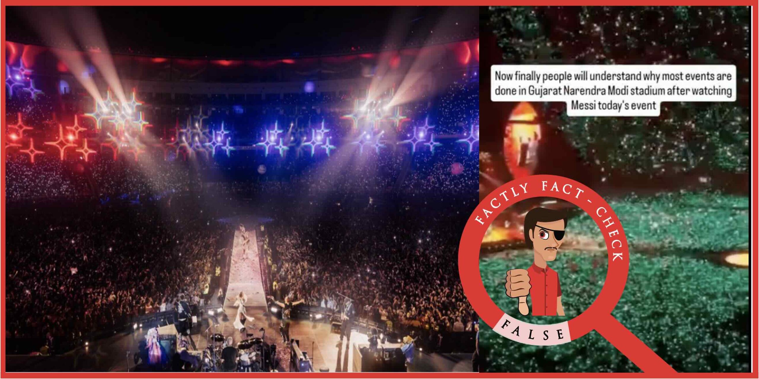 Fact: The video is from a Coldplay concert held at Narendra Modi Stadium, Ahmedabad, on 26 January 2025, months before Messi’s December 2025 India tour. During his recent visit, Messi travelled to Kolkata, Hyderabad, Mumbai, and New Delhi, and did not visit Ahmedabad. Hence, the claim is FALSE.