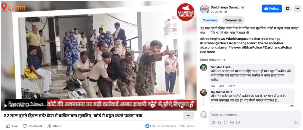 Further investigation using relevant keywords on Google led us to multiple media reports from June 2025 related to this incident (here, here, and here). According to these reports, the incident took place on 20 June 2025, when Amber Imam Hashmi, a senior advocate from Darbhanga, Bihar, was taken into custody by police at the Darbhanga Civil Court. The detention followed an order from ADJ-3 Suman Kumar in a case of perjury connected to a 32-year-old murder case. Hashmi had submitted Form 317 seeking exemption from appearing in court, but later arrived to present a petition, which prompted the court to order his detention.