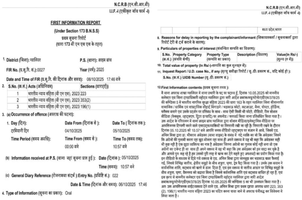 A controversy has emerged over the proposed installation of a statue of Dr. B.R. Ambedkar on the Madhya Pradesh High Court campus. The issue escalated after a video of Anil Mishra, a High Court advocate and former Bar Association president, surfaced, allegedly showing him insulting Dr. Ambedkar. FIRs were filed against him in Gwalior and Maharashtra. Several political and social organisations, including the Bhim Army, protested, but after discussions with the administration, they postponed their planned protest on 15 October 2025. While groups like the Bhim Army, the OBC Mahasabha, and some lawyers are demanding the installation of the statue, a section of Brahmin lawyers has opposed it. In response to the rising tensions, the district administration has imposed Section 163 of the Criminal Procedure Code in the city.