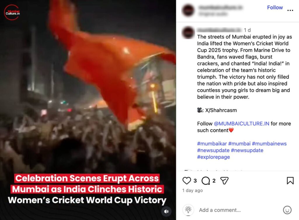 Following India’s 2025 ICC Women’s Cricket World Cup victory on 2 November 2025, videos of fans celebrating were widely shared on social media from different parts of the country (here, here). Several news outlets reported nationwide excitement, with congratulatory messages pouring in online for the Harmanpreet Kaur-led side.