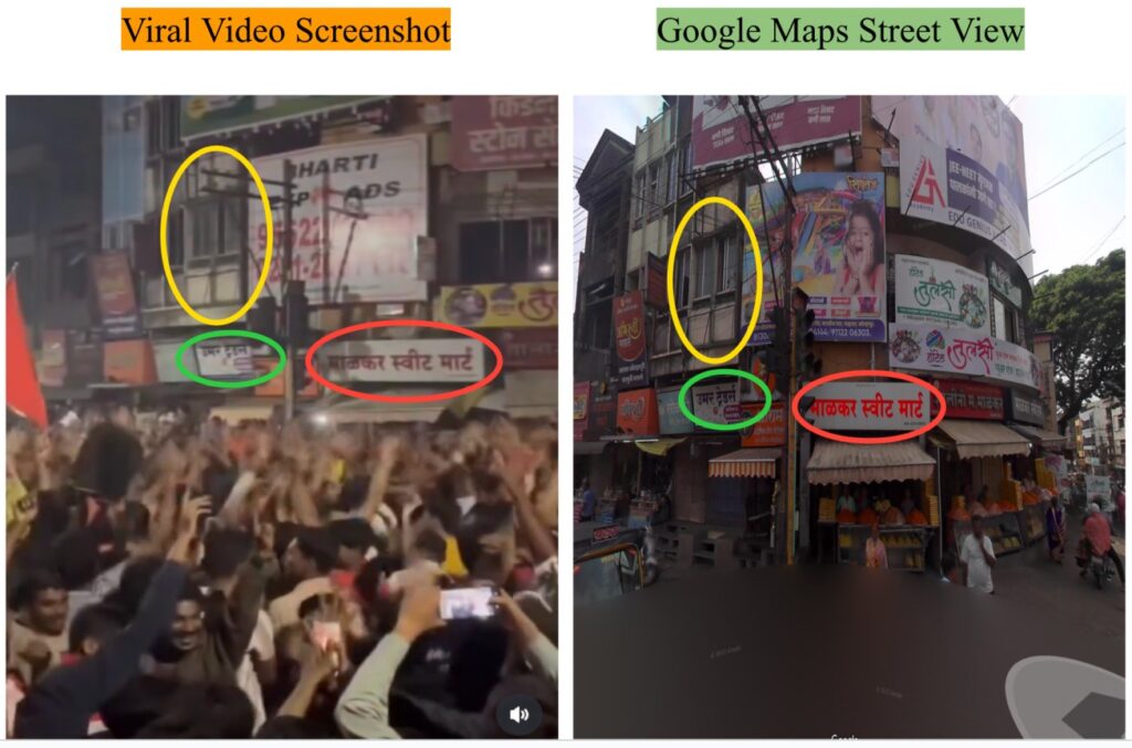 Upon closer observation, we spotted ‘Malkar Sweet Shop’ in Marathi in the video. Using this, we geolocated the spot to Bhausingji Road near Shivaji Chowk, Kavlapur, Kolhapur. The location in the video matches the view on Google Maps Street View. The comparison can be seen below.