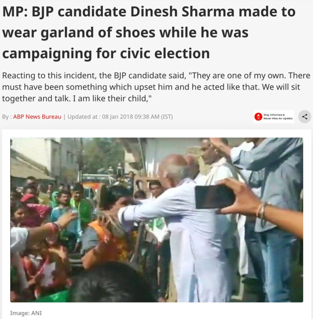 We also found multiple media reports from January 2018 reporting this incident (here, here, and here). According to these reports, the elderly man used the garland of shoes to protest against the acute water shortage in the area, alleging that women who raised complaints were repeatedly called to the police station. Reacting to the incident, Dinesh Sharma said the man belonged to his own community and that they would discuss the issue. Elections for 19 civic bodies, including Dhar, were scheduled for 17 January 2018.