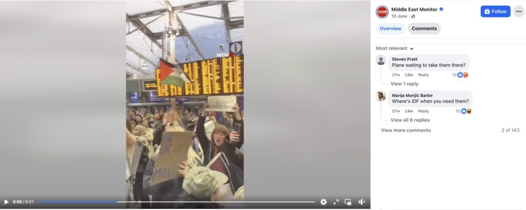 Further, using the available information, we conducted a keyword search on Google, which led us to a video posted by Middle East Monitor on Facebook on 10 June 2025. The video closely matches the viral clip and shows several people holding Palestinian flags and chanting slogans. According to the caption, the footage is from Piccadilly Railway Station in Manchester, UK.