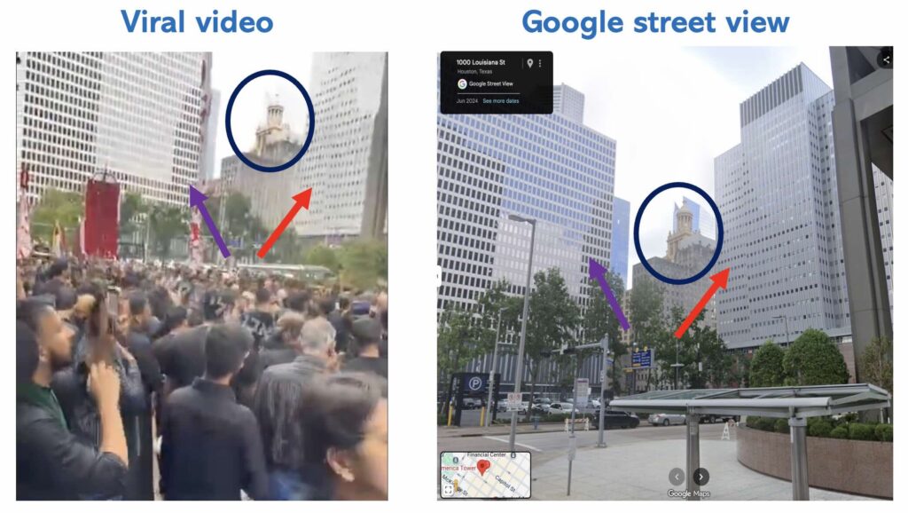 To confirm the location, we geolocated the area seen in the viral video and identified it as 1000 Louisiana St, Houston, Texas. A side-by-side comparison of a still from the viral video and visuals from Google Maps shows matching buildings and street structures. Notably, the Esperson Buildings, a historic landmark located at 808 Travis St, Houston, Texas, are clearly visible in the background. This confirms that the viral video was filmed in Texas, not New York.