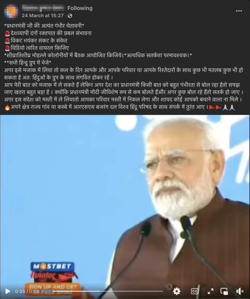 Claim: A recent video of Prime Minister Modi warning people of India to be vigilant about riots that could possibly happen soon.