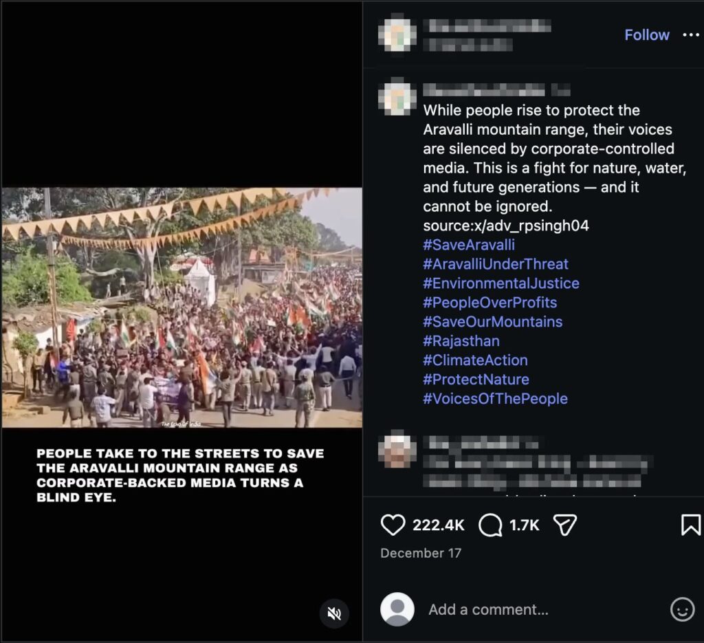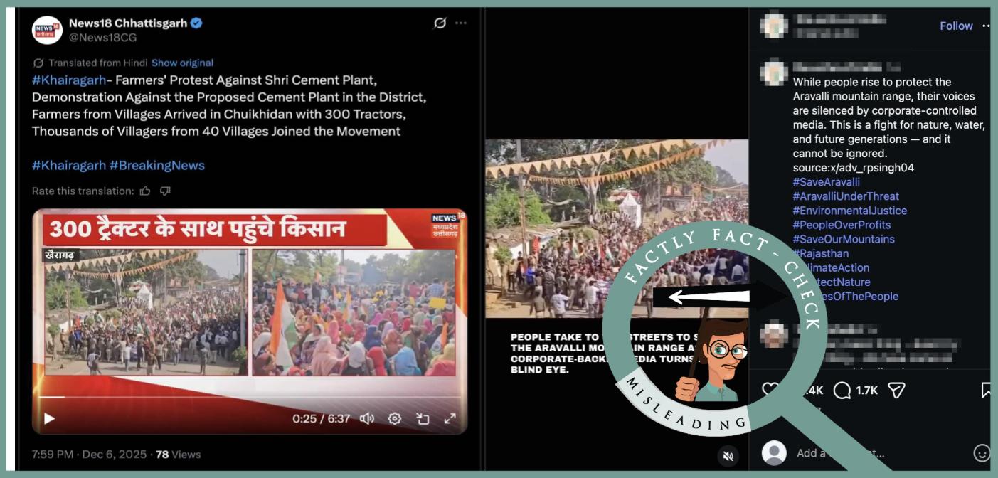 Fact: The video actually shows villagers in Khairagarh, Chhattisgarh, protesting against a proposed cement plant, and is unrelated to the Aravalli hills controversy. Hence, the claim made in the post is Misleading.