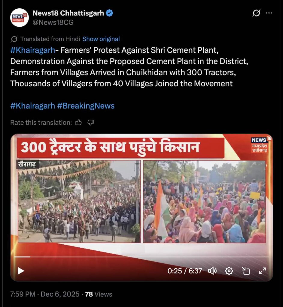 To verify the claim, we conducted a reverse image search on several keyframes from the viral video. This search led us to an Instagram post from 7 December 2025 that contained the same video. According to the description of this post, the video shows a protest in Khairagarh, Chhattisgarh, against the Shree Cement plant.