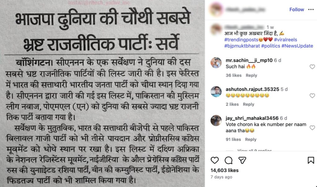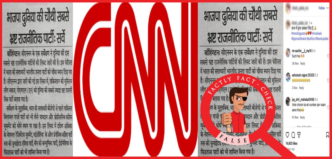 A news clip is going viral on social media (here, here, and here) claiming that a CNN survey ranked the Bharatiya Janata Party (BJP) as the fourth most corrupt political party in the world. The clip also alleges that the Pakistan Muslim League tops the list. Let’s verify the claim made in the post in this article.