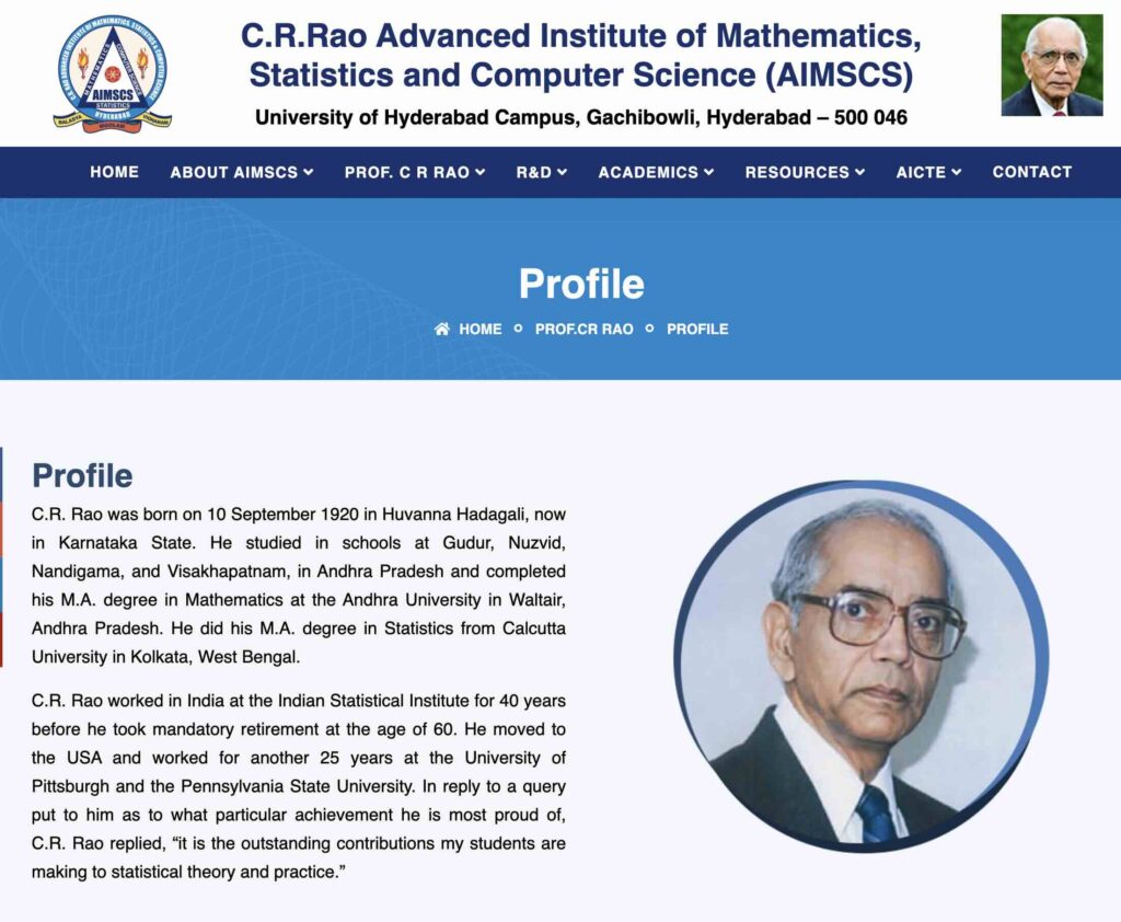 Prof. C. R. Rao was born on 10 September 1920 in Huvanna Hadagali, now in Karnataka. He attended schools in Gudur, Nuzvid, Nandigama, and Visakhapatnam in Andhra Pradesh and completed his M.A. in Mathematics at Andhra University, Waltair. He later earned an M.A. in Statistics from Calcutta University, Kolkata, West Bengal. C. R. Rao worked in India at the Indian Statistical Institute for 40 years before taking mandatory retirement at the age of 60. He then moved to the USA, where he worked for another 25 years at the University of Pittsburgh and Pennsylvania State University. He has also been awarded the Padma Bhushan (1968) and the Padma Vibhushan (2001) by the Government of India. In recognition of his contributions, the Government of India has instituted a biennial national award in statistics known as the Professor C. R. Rao Award. In his honour, Pennsylvania State University has established the C. R. and Bhargavi Rao Prize in Statistics. C. R. Rao passed away at the age of 102 on 22 August 2023 (here, here, here, and here).