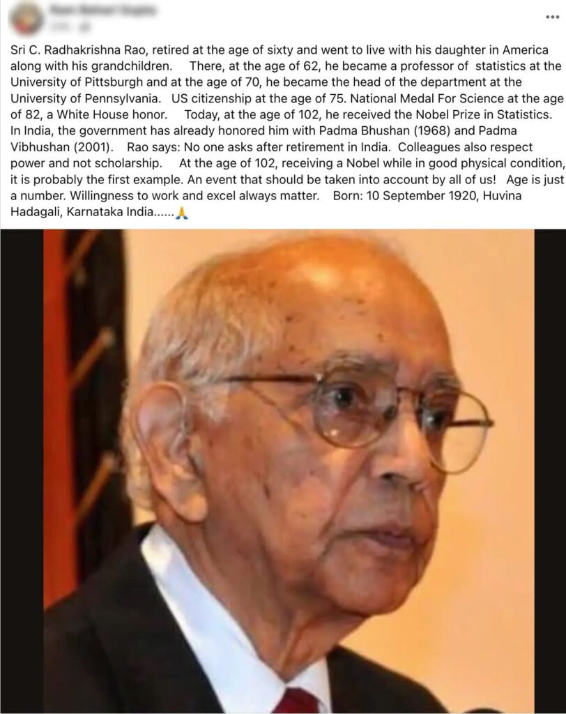 Fact: In 2023, at the age of 102, Indian-American mathematician and statistician Calyampudi Radhakrishna Rao (C. R. Rao) received the International Prize in Statistics, widely regarded as the equivalent of a Nobel Prize in the field of statistics. He passed away on 22 August 2023. C. R. Rao was also awarded the Padma Bhushan (1968) and the Padma Vibhushan (2001) by the Government of India. It should be noted that the Nobel Prize is not awarded in the field of statistics. Currently, Nobel Prizes are awarded in six categories: Physics, Chemistry, Physiology or Medicine, Literature, Peace, and Economic Sciences (the latter was added in 1968 by the Swedish Central Bank and was not included in Alfred Nobel’s will). Hence the claim made in the post is MISLEADING.