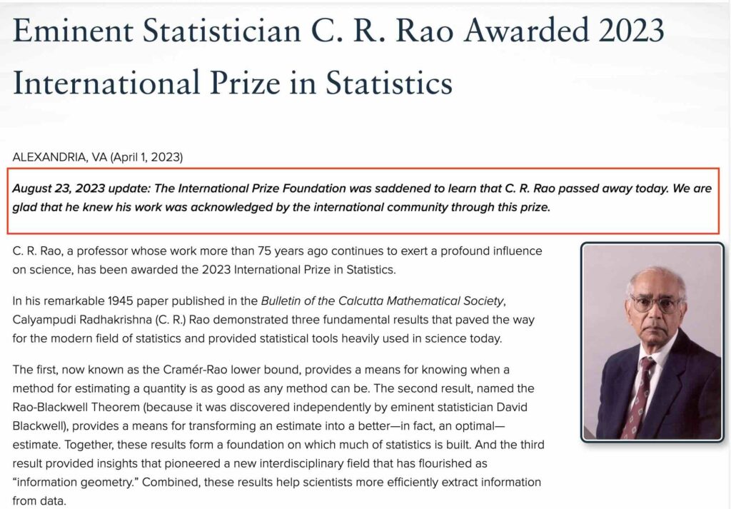 Indian-American mathematician and statistician Calyampudi Radhakrishna Rao (C. R. Rao) received the International Prize in Statistics in 2023, at the age of 102, which is widely regarded as the equivalent of a Nobel Prize in the field of statistics (here, here, here, and here).