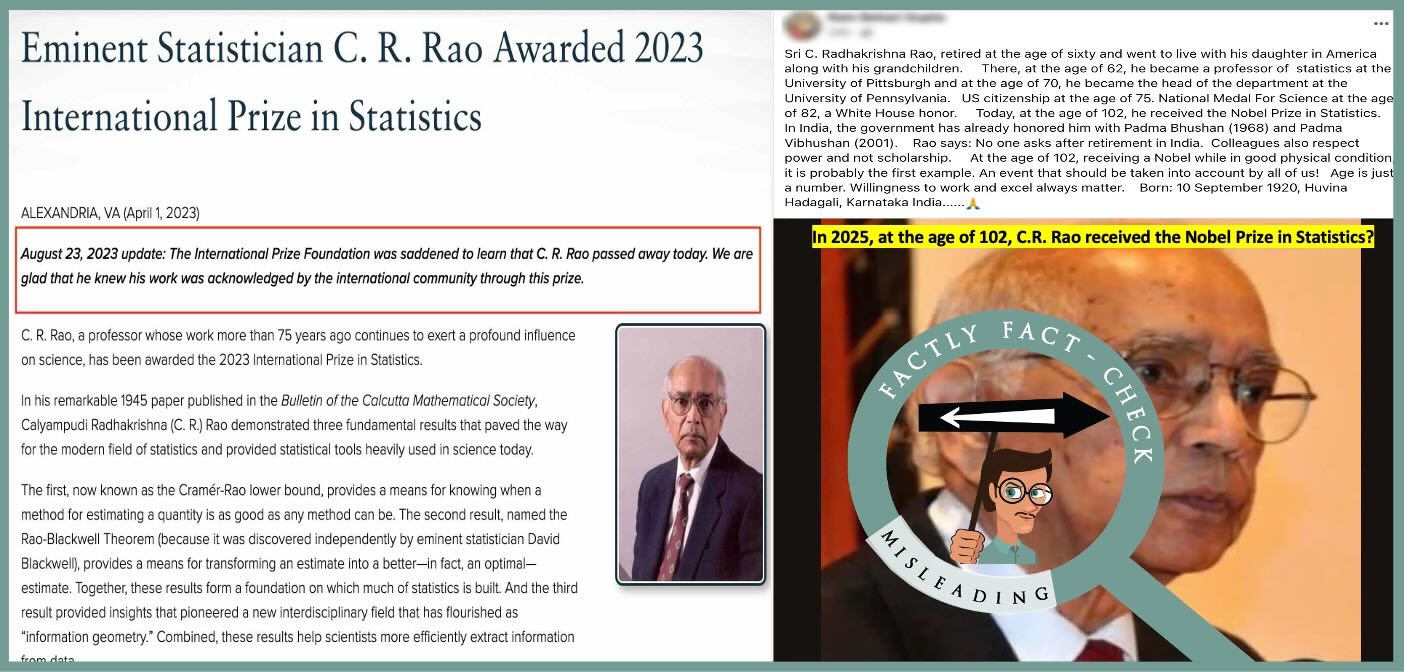 Recently, the Nobel Prizes for the year 2025 were announced. In this context, a post claiming that Indian-American statistician C. Radhakrishna Rao received the Nobel Prize in Statistics in 2025 at the age of 102 is going viral on social media platforms (here, here, here, and here). In this article, we fact-check the claim made in the post.