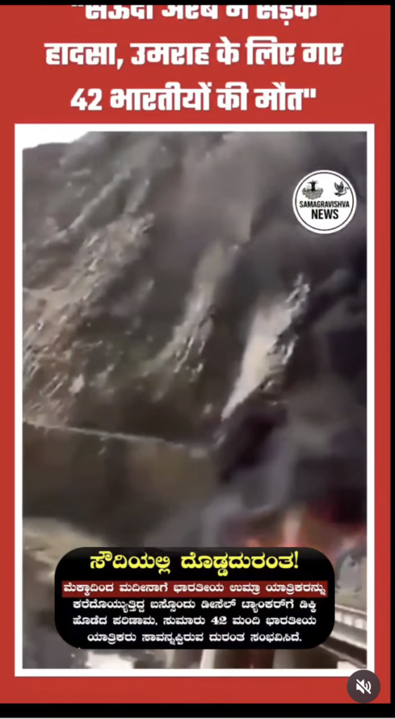 ಕ್ಲೇಮ್: ಈ ವೀಡಿಯೊದಲ್ಲಿ ಭಾರತೀಯ ಉಮ್ರಾ ಯಾತ್ರಾರ್ಥಿಗಳು ಪ್ರಾಣ ಕಳೆದುಕೊಂಡ 2025 ರ ಸೌದಿ ಅರೇಬಿಯಾದ ಮದೀನಾ ಬಳಿಯ ಬಸ್ ಅಪಘಾತವನ್ನು ತೋರಿಸುತ್ತದೆ.