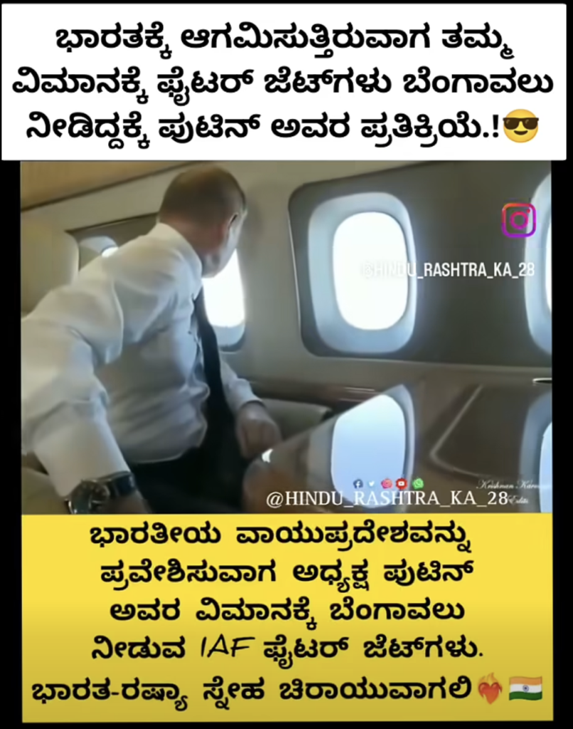ರಷ್ಯಾ ಅಧ್ಯಕ್ಷ 2025ರ ಡಿಸೆಂಬರ್ 4 ಮತ್ತು 5 ರಂದು 23ನೇ ಭಾರತ-ರಷ್ಯಾ ವಾರ್ಷಿಕ ಶೃಂಗಸಭೆಗಾಗಿ (ಇಲ್ಲಿ, ಇಲ್ಲಿ ಮತ್ತು ಇಲ್ಲಿ) ಭಾರತಕ್ಕೆ ಭೇಟಿ ನೀಡಿದ್ದರು. ಈ ಸಮಯದಲ್ಲಿ, ವಿಮಾನದೊಳಗೆ ಕುಳಿತು ಕಿಟಕಿಯಿಂದ ಬೆಂಗಾವಲು ಯುದ್ಧ ವಿಮಾನಗಳನ್ನು ನೋಡುತ್ತಿರುವಂತೆ ತೋರುವ ವಿಡಿಯೋ (ಇಲ್ಲಿ) ಸಾಮಾಜಿಕ ಮಾಧ್ಯಮಗಳಲ್ಲಿ ವೈರಲ್ ಆಗಿದೆ. ವಿಮಾನವು ಭಾರತೀಯ ವಾಯುಪ್ರದೇಶವನ್ನು ಪ್ರವೇಶಿಸುತ್ತಿದ್ದಾಗ ಭಾರತೀಯ ವಾಯುಪಡೆಯ ಜೆಟ್ಗಳು ಅವರ ವಿಮಾನಕ್ಕೆ ಬೆಂಗಾವಲು ನೀಡುತ್ತಿದ್ದವು ಎಂದು ಕ್ಲೇಮ್ ಮಾಡಲಾಗಿದೆ. ಈ ವಿಡಿಯೋದ ಹಿಂದಿನ ಸತ್ಯಾಂಶವನ್ನು ಪರಿಶೀಲಿಸೋಣ.