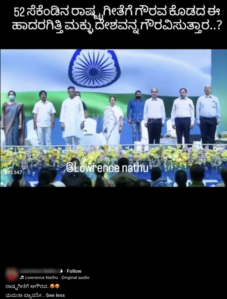 ರಾಷ್ಟ್ರಗೀತೆ ಮುಗಿಯುವ ಮುನ್ನ ಮಮತಾ ಬ್ಯಾನರ್ಜಿ ಕಾರ್ಯಕ್ರಮವೊಂದರ ವೇದಿಕೆಯಿಂದ ಹೊರನಡೆಯುತ್ತಿರುವ ವೀಡಿಯೊವೊಂದು (ಇಲ್ಲಿ ) ಸಾಮಾಜಿಕ ಮಾಧ್ಯಮದಲ್ಲಿ ಹರಿದಾಡುತ್ತಿದೆ. “52 ಸೆಕೆಂಡುಗಳ ರಾಷ್ಟ್ರಗೀತೆಯನ್ನು ಗೌರವಿಸದವರು ದೇಶವನ್ನು ಹೇಗೆ ಗೌರವಿಸಲು ಸಾಧ್ಯ?” ಎಂಬಂತಹ ಕ್ಲೇಮ್ ನೊಂದಿಗೆ ಇದನ್ನು ಹಂಚಿಕೊಳ್ಳಲಾಗುತ್ತಿದೆ. ಹಾಗಾದರೆ ಈ ಪೋಸ್ಟ್ ನಲ್ಲಿ ಮಾಡಲಾದ ಕ್ಲೇಮನ್ನು ಪರಿಶೀಲಿಸೋಣ