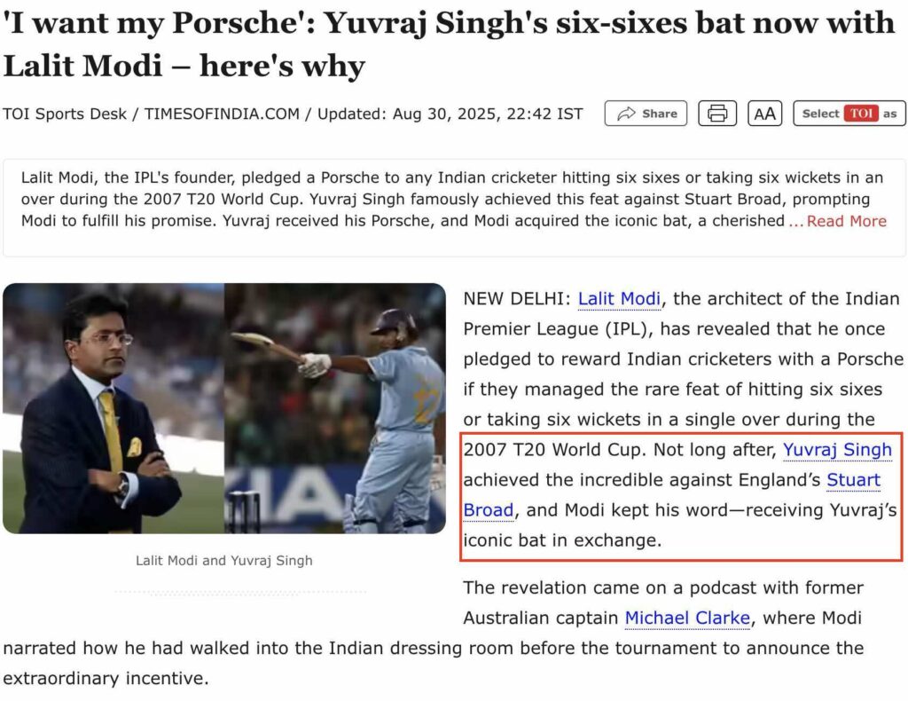 ಇನ್ನು ಈ ವಿಷಯದ ಬಗ್ಗೆ ಲಲಿತ್ ಮೋದಿ ಏನೆಂದು ಹೇಳಿದ್ದಾರೆ ಎಂದು ತಿಳಿದುಕೊಳ್ಳಲು, ಸೂಕ್ತವಾದ ಕೀವರ್ಡ್ಗಳನ್ನು ಬಳಸಿ ಇಂಟರ್ನೆಟ್ನಲ್ಲಿ ಹುಡುಕಿದಾಗ, ಅವರು ಈ ವಿಷಯದ ಬಗ್ಗೆ ‘Raj Shamani’ ಪಾಡ್ಕಾಸ್ಟ್ ಮತ್ತು ಆಸ್ಟ್ರೇಲಿಯಾ ಕ್ರಿಕೆಟಿಗ ಸ್ಟುವರ್ಟ್ ಕ್ಲಾರ್ಕ್ ಅವರ ಪಾಡ್ಕಾಸ್ಟ್ಗಳಲ್ಲಿ ಮಾತನಾಡಿದ್ದಾರೆ ಎಂದು ನಮಗೆ ತಿಳಿದುಬಂದಿದೆ (ಇಲ್ಲಿ, ಇಲ್ಲಿ, ಇಲ್ಲಿ). ಹಾಗೆಯೇ, ಯುವರಾಜ್ ಸಿಂಗ್ ಆರು ಸಿಕ್ಸರ್ಗಳನ್ನು ಹೊಡೆದ ನಂತರ, ಲಲಿತ್ ಮೋದಿ ಅವರಿಗೆ ಪೋರ್ಷೆ ಕಾರನ್ನು ನೀಡಿ ಅವರ ಬ್ಯಾಟನ್ನು ಪಡೆದುಕೊಂಡಿದ್ದಾರೆ ಎಂದು ಟೈಮ್ಸ್ ಆಫ್ ಇಂಡಿಯಾ ತನ್ನ ಆಗಸ್ಟ್ 2025ರ ಲೇಖನದಲ್ಲಿ ಉಲ್ಲೇಖಿಸಿದೆ.