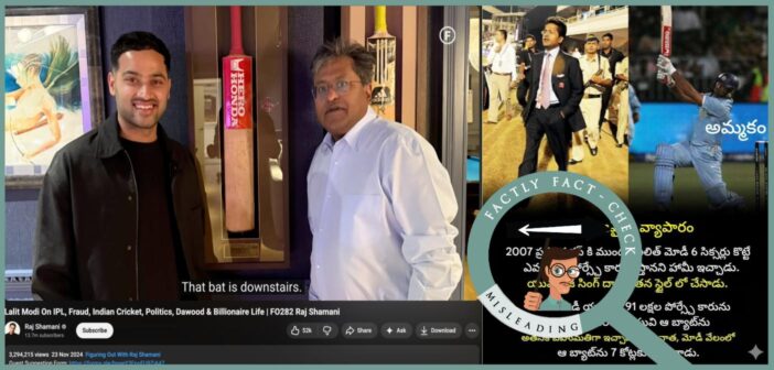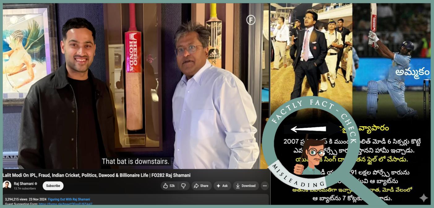 ಫ್ಯಾಕ್ಟ್ : ಸುದ್ದಿ ವರದಿಗಳ ಪ್ರಕಾರ, ಲಲಿತ್ ಮೋದಿ ಯುವರಾಜ್ ಸಿಂಗ್ಗೆ ಪೋರ್ಷೆ ಕಾರನ್ನು ನೀಡಿದ್ದು ನಿಜ. ಆದರೆ ಯುವರಾಜ್ ಸಿಂಗ್ ಅವರ ಬ್ಯಾಟನ್ನು ಲಲಿತ್ ಮೋದಿ 7 ಕೋಟಿಗೆ ಹರಾಜಿನಲ್ಲಿ ಮಾರಾಟ ಮಾಡಿದ್ದಾರೆ ಎಂಬುದಕ್ಕೆ ಯಾವುದೇ ವಿಶ್ವಾಸಾರ್ಹ ಸುದ್ದಿ ವರದಿಗಳು ಲಭ್ಯವಿಲ್ಲ. ಆ ಬ್ಯಾಟ್ ತಮ್ಮ ಮನೆಯಲ್ಲೇ ಇದೆ ಎಂದು ಲಲಿತ್ ಮೋದಿ ಅವರು ರಾಜ್ ಶಮಾನಿ ಮತ್ತು ಆಸ್ಟ್ರೇಲಿಯಾದ ಕ್ರಿಕೆಟಿಗ ಸ್ಟುವರ್ಟ್ ಕ್ಲಾರ್ಕ್ ಅವರ ಪಾಡ್ಕಾಸ್ಟ್ಗಳಲ್ಲಿ ತಿಳಿಸಿದ್ದಾರೆ. ರಾಜ್ ಶಮಾನಿ ಪಾಡ್ಕಾಸ್ಟ್ನಲ್ಲಿ ಮೋದಿ ಆ ಬ್ಯಾಟನ್ನು ತೋರಿಸಿದ್ದಾರೆ ಕೂಡ. ಆದ್ದರಿಂದ, ಈ ಪೋಸ್ಟ್ನಲ್ಲಿ ಮಾಡಲಾಗುತ್ತಿರುವ ಕ್ಲೇಮ್ ದಾರಿ ತಪ್ಪಿಸುವಂತಿದೆ.