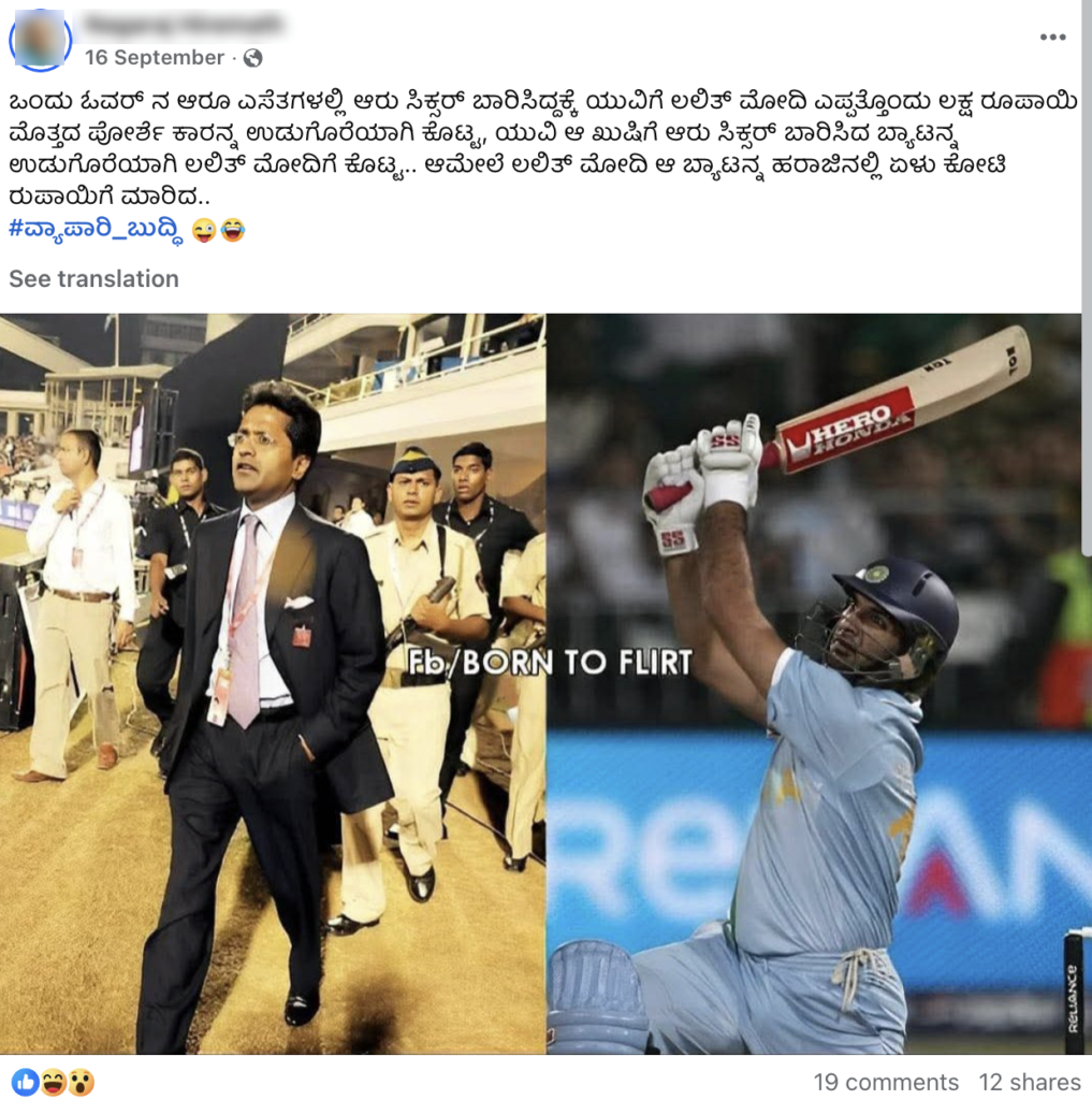 ಕೊನೆಯದಾಗಿ, 2007ರ ಕ್ರಿಕೆಟ್ ವಿಶ್ವಕಪ್ನಲ್ಲಿ ಒಂದೇ ಓವರ್ನಲ್ಲಿ ಆರು ಸಿಕ್ಸರ್ಗಳನ್ನು ಹೊಡೆದಿದ್ದಕ್ಕಾಗಿ ಯುವರಾಜ್ ಸಿಂಗ್ಗೆ ಲಲಿತ್ ಮೋದಿ 91 ಲಕ್ಷ ರೂಪಾಯಿ ಮೌಲ್ಯದ ಪೋರ್ಷೆ ಕಾರನ್ನು ಉಡುಗೊರೆಯಾಗಿ ನೀಡಿ, ಆ ಬ್ಯಾಟನ್ನು 7 ಕೋಟಿಗೆ ಹರಾಜಿನಲ್ಲಿ ಮಾರಾಟ ಮಾಡಿದ್ದಾರೆ ಎಂಬ ಒಂದು ತಪ್ಪು ಸುದ್ದಿಯನ್ನು ಹಂಚಿಕೊಳ್ಳಲಾಗುತ್ತಿದೆ.