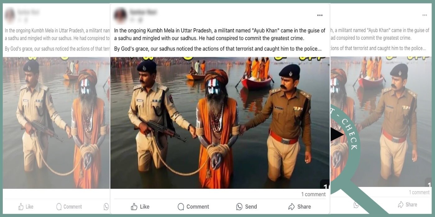 ಕ್ಲೇಮ್: 2025 ರ ಮಹಾಕುಂಭ ಮೇಳದಲ್ಲಿ ಸಂತನ ವೇಷ ಧರಿಸಿದ್ದ ಅಯೂಬ್ ಖಾನ್ ಎಂಬ ಭಯೋತ್ಪಾದಕನನ್ನು ಪೊಲೀಸರು ಬಂಧಿಸಿರುವ ಫೋಟೋ.