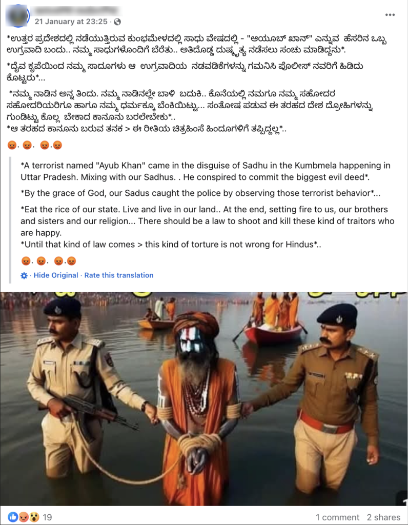 “2025 ರ ಮಹಾಕುಂಭ ಮೇಳದ ಸಮಯದಲ್ಲಿ ಪೊಲೀಸರು ಆಯುಬ್ ಖಾನ್ ಎಂಬ ಭಯೋತ್ಪಾದಕನನ್ನು ಹಿಡಿದಿದ್ದು, ಅವನು ಸಂತನ ಮಾರುವೇಷ ಧರಿಸಿ ಬಂದು ನಮ್ಮ ಸಂತರನ್ನು ಭೇಟಿಯಾದನೆಂದು ಇಬ್ಬರು ಪೊಲೀಸ್ ಅಧಿಕಾರಿಗಳನ್ನು ನೀರಿನಲ್ಲಿ ಹಿಡಿದಿಟ್ಟುಕೊಂಡಿರುವ ಫೋಟೋ ಸಾಮಾಜಿಕ ಮಾಧ್ಯಮದಲ್ಲಿ (ಇಲ್ಲಿ) ವೈರಲ್ ಆಗುತ್ತಿದೆ. ಹಾಗಾದರೆ ಈ ಪೋಸ್ಟ್ ನಲ್ಲಿ ಮಾಡಲಾದ ಕ್ಲೇಮ್ ಅನ್ನು ಪರಿಶೀಲಿಸೋಣ.