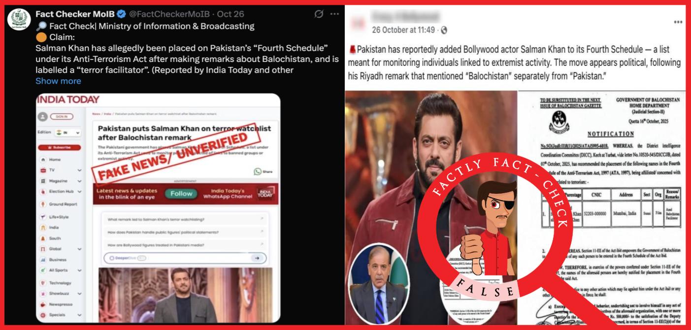 ಪಾಕಿಸ್ತಾನ ಸರ್ಕಾರವಾಗಲಿ ಅಥವಾ ಬಲೂಚಿಸ್ತಾನ ಸರ್ಕಾರವಾಗಲಿ ನಟ ಸಲ್ಮಾನ್ ಖಾನ್ ಅವರನ್ನು ಭಯೋತ್ಪಾದನಾ ವಿರೋಧಿ ಕಾಯಿದೆಯ ನಾಲ್ಕನೇ ಶೆಡ್ಯೂಲ್ಗೆ ಸೇರಿಸಿದ್ದಾರೆ ಎಂಬುದಕ್ಕೆ ನಮಗೆ ಯಾವುದೇ ಅಧಿಕೃತ ಮಾಹಿತಿ ಅಥವಾ ವಿಶ್ವಾಸಾರ್ಹ ಪಾಕಿಸ್ತಾನಿ ಮಾಧ್ಯಮ ವರದಿಗಳು ಕಂಡುಬಂದಿಲ್ಲ. “ಭಯೋತ್ಪಾದನಾ ವಿರೋಧಿ ಕಾಯಿದೆಯಡಿಯಲ್ಲಿ ಸಲ್ಮಾನ್ ಖಾನ್ ಅವರನ್ನು ಪಾಕಿಸ್ತಾನದ ‘ನಾಲ್ಕನೇ ಶೆಡ್ಯೂಲ್ಗೆ’ ಸೇರಿಸಲಾಗಿದೆ ಎಂಬ ಪ್ರತಿಪಾದನೆಗಳು ಸುಳ್ಳು ಮತ್ತು ಪರಿಶೀಲನೆಗೆ ಒಳಪಡದ ವದಂತಿಗಳಾಗಿವೆ.” ಎಂದು ಪಾಕಿಸ್ತಾನದ ಮಾಹಿತಿ ಮತ್ತು ಪ್ರಸಾರ ಸಚಿವಾಲಯದ ಫ್ಯಾಟ್ ಚೆಕ್ ಯೂನಿಟ್ ಅಕ್ಟೋಬರ್ 26, 2025 ರಂದು X ಪೋಸ್ಟ್ ಮೂಲಕ ಇದನ್ನು ಸ್ಪಷ್ಟಪಡಿಸಿದೆ.