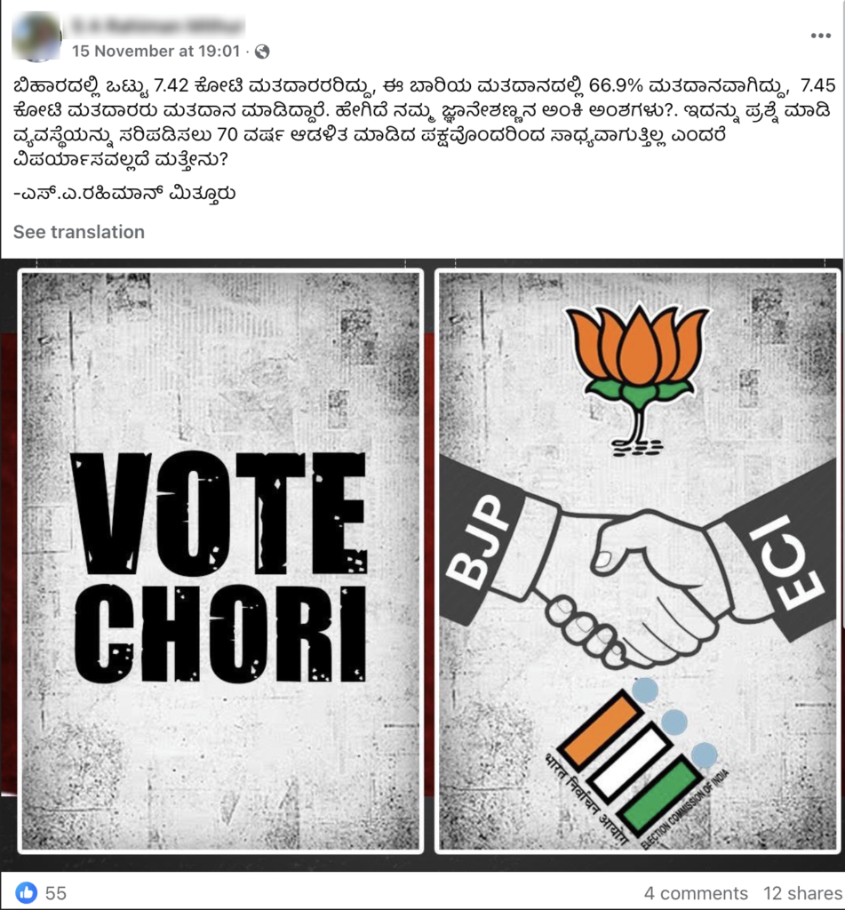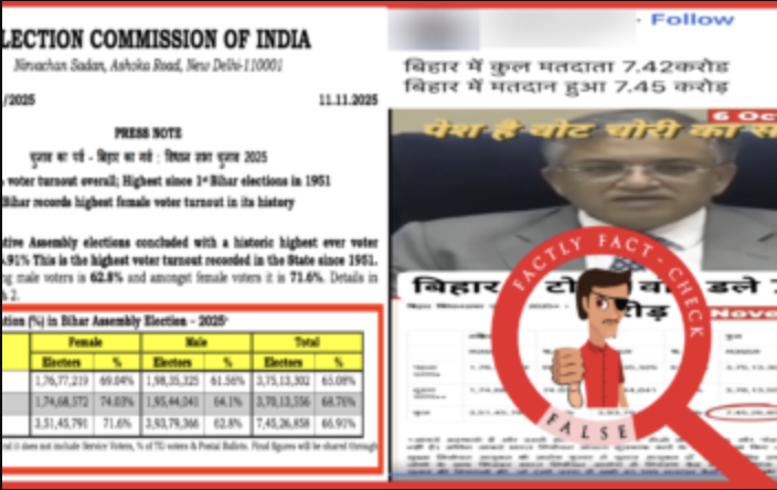 ಈ ಹಿನ್ನೆಲೆಯಲ್ಲಿ, ವ್ಯಾಪಕವಾಗಿ ಹರಿದಾಡಿದ ಸಾಮಾಜಿಕ ಮಾಧ್ಯಮ ಪೋಸ್ಟ್ (ಇಲ್ಲಿ) ಮತದಾರರ ಹಾಜರಾತಿ 100% ಮೀರಿದೆ ಎಂದು ಹೇಳುತ್ತದೆ. 2025 ರ ಬಿಹಾರ ವಿಧಾನಸಭಾ ಚುನಾವಣೆಗೆ ಕೇವಲ 7.42 ಕೋಟಿ ನೋಂದಾಯಿತ ಮತದಾರರಿದ್ದರೂ 7.45 ಕೋಟಿ ಮತಗಳನ್ನು ಚಲಾಯಿಸಲಾಗಿದೆ ಎಂದು ಆರೋಪಿಸಿದೆ. ಹಾಗಾದರೆ ಈ ಪೋಸ್ಟ್ ನಲ್ಲಿ ಮಾಡಿದ ಕ್ಲೇಮ್ ಅನ್ನು ಪರಿಶೀಲಿಸೋಣ.