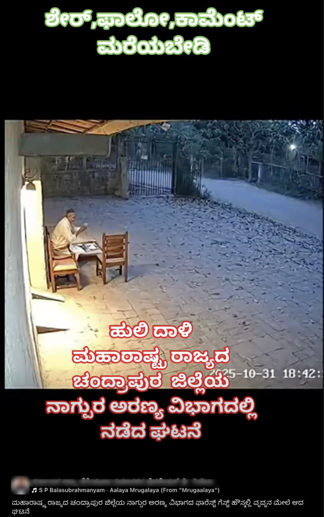 ಮಹಾರಾಷ್ಟ್ರದ ಚಂದ್ರಪುರ ಜಿಲ್ಲೆಯ ಬ್ರಹ್ಮಪುರಿ ಅರಣ್ಯ ಅತಿಥಿ ಗೃಹದಲ್ಲಿ ಹುಲಿಯು ಮನುಷ್ಯನ ಮೇಲೆ ದಾಳಿ ಮಾಡುತ್ತಿರುವ ಸಿಸಿಟಿವಿ ದೃಶ್ಯಾವಳಿ ಎಂದು ಹೇಳುವ ವಿಡಿಯೋವನ್ನು ಸೋಶಿಯಲ್ ಮೀಡಿಯಾದಲ್ಲಿ ಶೇರ್ ಮಾಡಲಾಗುತ್ತಿದೆ (ಇಲ್ಲಿ). ಈ ವಿಡಿಯೋದಲ್ಲಿ, ಹೊರಗೆ ಕುಳಿತಿರುವ ವ್ಯಕ್ತಿಯ ಬಳಿ ಹುಲಿಯೊಂದು ಇದ್ದಕ್ಕಿದ್ದಂತೆ ಕಾಣಿಸಿಕೊಂಡು ಆತನನ್ನು ಎಳೆದುಕೊಂಡು ಹೋಗುವುದನ್ನು ತೋರಿಸುತ್ತದೆ. ಹಾಗಾದರೆ ಪೋಸ್ಟ್ನಲ್ಲಿ ಮಾಡಿದ ಕ್ಲೇಮ್ ಅನ್ನು ಪರಿಶೀಲಿಸೋಣ.
