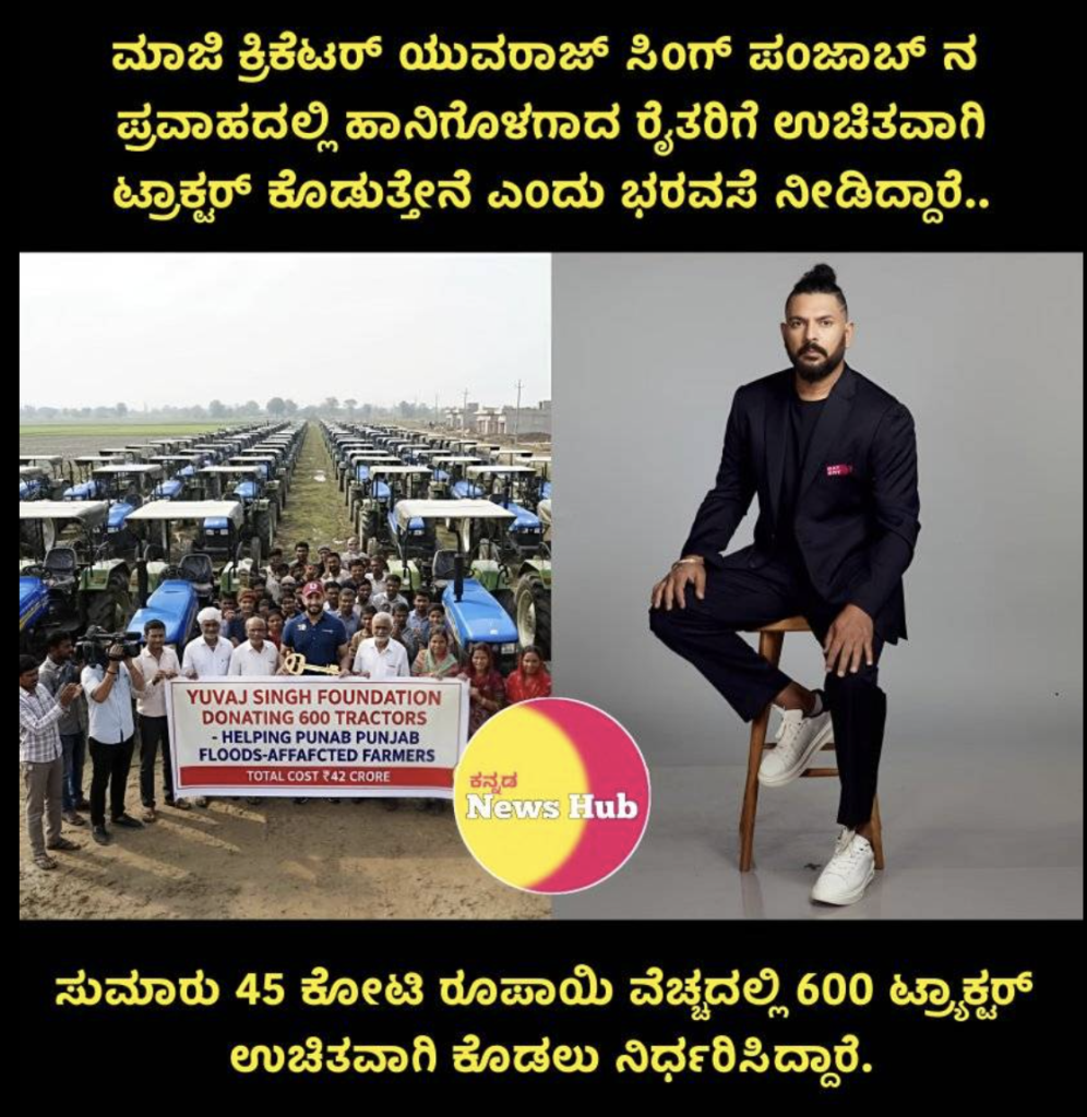 2025 ರ ಪಂಜಾಬ್ ಪ್ರವಾಹದಿಂದ ಹಾನಿಗೊಳಗಾದ ಕುಟುಂಬಗಳಿಗೆ ಭಾರತದ ಮಾಜಿ ಕ್ರಿಕೆಟಿಗ ಯುವರಾಜ್ ಸಿಂಗ್ ₹42 ಕೋಟಿ ಮೌಲ್ಯದ 600 ಟ್ರ್ಯಾಕ್ಟರ್ಗಳನ್ನು ದಾನ ಮಾಡಲು ನಿರ್ಧರಿಸಿದ್ದಾರೆ ಎಂಬ ಪೋಸ್ಟ್ ಸಾಮಾಜಿಕ ಮಾಧ್ಯಮದಲ್ಲಿ (ಇಲ್ಲಿ) ವೈರಲ್ ಆಗುತ್ತಿದೆ. ಈ ಲೇಖನದ ಮೂಲಕ ಪೋಸ್ಟ್ನಲ್ಲಿ ಮಾಡಲಾದ ಕ್ಲೇಮ್ ಅನ್ನು ಪರಿಶೀಲಿಸೋಣ.