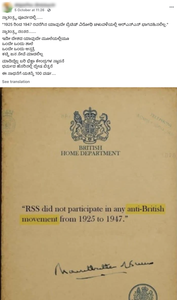 ಕ್ಲೇಮ್: 1925 ಮತ್ತು 1947 ರ ನಡುವಿನ ಬ್ರಿಟಿಷ್ ವಿರೋಧಿ ಚಳವಳಿಯಲ್ಲಿ ಆರ್ಎಸ್ಎಸ್ ಭಾಗಿಯಾಗಿರಲಿಲ್ಲ ಎಂದು ಬ್ರಿಟಿಷ್ ಗೃಹ ಕಚೇರಿಯ ದಾಖಲೆ ಹೇಳುತ್ತದೆ.