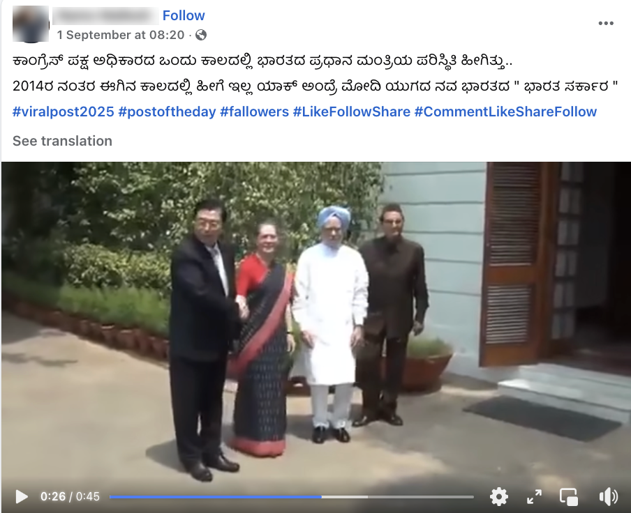 2025 ರ ಆಗಸ್ಟ್ 31 ರಿಂದ ಸೆಪ್ಟೆಂಬರ್ 01 ರವರೆಗೆ ಚೀನಾದ ಟಿಯಾಂಜಿನ್ನಲ್ಲಿ ನಡೆದ ಶಾಂಘೈ ಸಹಕಾರ ಸಂಸ್ಥೆ (SCO) ರಾಷ್ಟ್ರಗಳ ಮುಖ್ಯಸ್ಥರ 25 ನೇ ಶೃಂಗಸಭೆಯಲ್ಲಿ ಭಾರತದ ಪ್ರಧಾನಿ ನರೇಂದ್ರ ಮೋದಿ ಭಾಗವಹಿಸಿದ್ದರು. ಈ ಶೃಂಗಸಭೆಯ ಹೊರತಾಗಿ, ಪೀಪಲ್ಸ್ ರಿಪಬ್ಲಿಕ್ ಆಫ್ ಚೀನಾದ ಅಧ್ಯಕ್ಷ ಕ್ಸಿ ಜಿನ್ಪಿಂಗ್ ಅವರನ್ನು ಪ್ರಧಾನಿ ಮೋದಿ ಭೇಟಿಯಾದರು. ಈ ಸಂದರ್ಭದಲ್ಲಿ, ಮಾಜಿ ಕಾಂಗ್ರೆಸ್ ಅಧ್ಯಕ್ಷೆ ಸೋನಿಯಾ ಗಾಂಧಿ ಮತ್ತು ಮಾಜಿ ಪ್ರಧಾನಿ ಮನಮೋಹನ್ ಸಿಂಗ್ ಅವರು ಚೀನಾದ ನಿಯೋಗವನ್ನು ಭೇಟಿಯಾದ ವೀಡಿಯೊ (ಇಲ್ಲಿ) ಸಾಮಾಜಿಕ ಮಾಧ್ಯಮದಲ್ಲಿ ವೈರಲ್ ಆಗುತ್ತಿದೆ. ಮನಮೋಹನ್ ಸಿಂಗ್ ಅವರು ಪ್ರಧಾನಿಯಾಗಿದ್ದ ಅವಧಿಯಲ್ಲಿ ಈ ಘಟನೆ ಸಂಭವಿಸಿದೆ ಮತ್ತು ಸೋನಿಯಾ ಗಾಂಧಿ ಅತಿಥಿಗಳನ್ನು ಸ್ವಾಗತಿಸುವಲ್ಲಿ ಮುಂದಾಳತ್ವ ವಹಿಸಿದ್ದದ್ದು, ಇದರ ಸಲುವಾಗಿ ಅವರನ್ನು ಕಡೆಗಣಿಸಲಾಯಿತು ಎಂದು ವೀಡಿಯೊದಲ್ಲಿ ಹೇಳಲಾಗಿದೆ. ಹಾಗಾದರೆ ಈ ಪೋಸ್ಟ್ನಲ್ಲಿ ಮಾಡಲಾದ ಕ್ಲೇಮ್ ಅನ್ನು ಪರಿಶೀಲಿಸೋಣ.