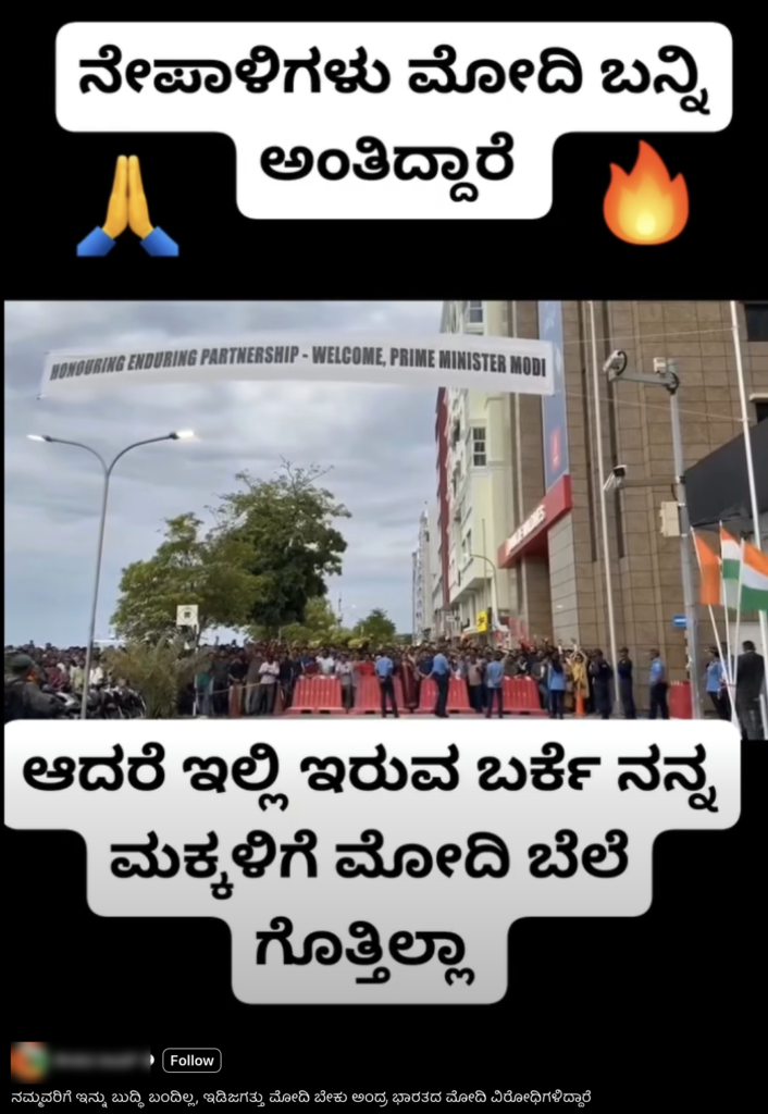 ಫ್ಯಾಕ್ಟ್: ವೈರಲ್ ವೀಡಿಯೊ ಸೆಪ್ಟೆಂಬರ್ 2025 ರ ಪ್ರತಿಭಟನೆಗಳ ನಡುವೆ ನೇಪಾಳದಲ್ಲಿ ಜನರು “ನರೇಂದ್ರ ಮೋದಿ ಜಿಂದಾಬಾದ್” ಎಂದು ಘೋಷಣೆ ಕೂಗುತ್ತಿರುವುದನ್ನು ಇದು ತೋರಿಸುವುತಿಲ್ಲ. ಜುಲೈ 2025 ರಲ್ಲಿ ಮಾಲ್ಡೀವ್ಸ್ನ ಮಾಲೆಯಲ್ಲಿರುವ ಧೋಶಿಮೆಯ್ನಾ ಕಟ್ಟಡಕ್ಕೆ ಪ್ರಧಾನಿ ನರೇಂದ್ರ ಮೋದಿ ಭೇಟಿ ನೀಡಿದ್ದನ್ನು ಇದು ತೋರಿಸುತ್ತದೆ. ಈ ಸಮಯದಲ್ಲಿ ಮಾಲ್ಡೀವಿಯನ್ ಅಧ್ಯಕ್ಷ ಮೊಹಮ್ಮದ್ ಮುಯಿಝು ಭಾರತದಿಂದ ನಿಧಿಸಂಗ್ರಹಿಸಲ್ಪಟ್ಟ ಹೊಸ ರಕ್ಷಣಾ ಸಚಿವಾಲಯದ ಪ್ರಧಾನ ಕಚೇರಿಯನ್ನು ಉದ್ಘಾಟಿಸುವಾಗ, ಅಲ್ಲಿನ ಜನರು “ಮೋದಿ ಜಿಂದಾಬಾದ್” ಎಂದು ಕೂಗಿದರು. ಹಾಗಾಗಿ ಈ ವೀಡಿಯೊ ನೇಪಾಳಕ್ಕೆ ಸಂಬಂಧಿಸಿಲ್ಲ. ಆದ್ದರಿಂದ, ಪೋಸ್ಟ್ನಲ್ಲಿ ಮಾಡಲಾದ ಕ್ಲೇಮ್ ದಾರಿ ತಪ್ಪಿಸುತ್ತಿದೆ.