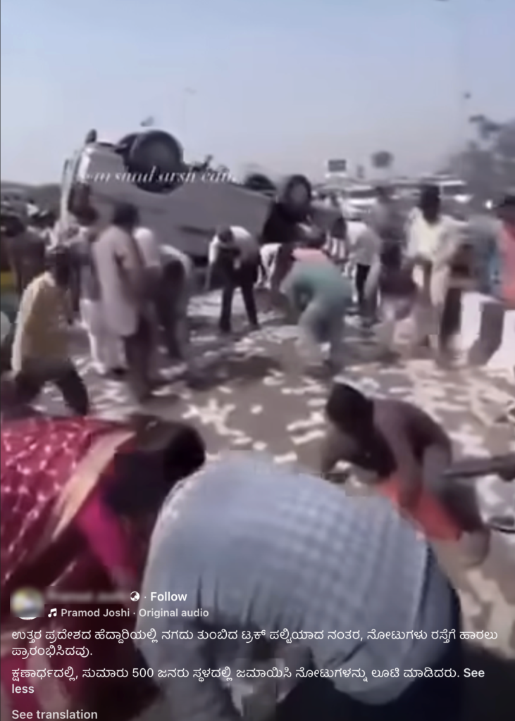 ಕ್ಲೇಮ್: ಹಣ ತುಂಬಿದ್ದ ಟ್ರಕ್ ಉತ್ತರ ಪ್ರದೇಶದಲ್ಲಿ ಅಪಘಾತಕ್ಕೀಡಾಗಿ, ರಸ್ತೆಯ ಮೇಲೆ ನಗದು ಚೆಲ್ಲಿದೆ, ಅದನ್ನು ಸಂಗ್ರಹಿಸಲು ಜನರು ಧಾವಿಸುತ್ತಿದ್ದಾರೆ ಎಂದು ವೀಡಿಯೊ ತೋರಿಸುತ್ತದೆ.