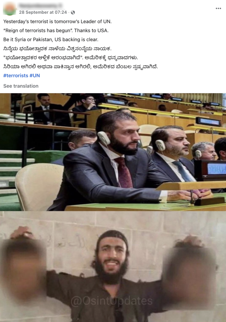 ಸಿರಿಯನ್ ಅಧ್ಯಕ್ಷ ಅಹ್ಮದ್ ಅಲ್-ಶರಾ ಅವರನ್ನು ವಿಶ್ವಸಂಸ್ಥೆಯಲ್ಲಿ ತೋರಿಸುವುದಾಗಿ ಹೇಳಿಕೊಳ್ಳುವ ಫೋಟೋಗಳ ಕೊಲಾಜ್ ಅನ್ನು ಸಾಮಾಜಿಕ ಮಾಧ್ಯಮದಲ್ಲಿ (ಇಲ್ಲಿ) ವ್ಯಾಪಕವಾಗಿ ಹಂಚಿಕೊಳ್ಳಲಾಗುತ್ತಿದೆ, ಜೊತೆಗೆ ಭಯೋತ್ಪಾದಕನಾಗಿದ್ದಾಗ ಅವರು ಕತ್ತರಿಸಿದ ಎರಡು ತಲೆಗಳನ್ನು ಹಿಡಿದಿರುವ ಚಿತ್ರವೂ ಇದೆ. “ನಿನ್ನೆಯ ಭಯೋತ್ಪಾದಕ ನಾಳೆಯ ವಿಶ್ವಸಂಸ್ಥೆಯ ನಾಯಕ. ಭಯೋತ್ಪಾದಕರ ಆಳ್ವಿಕೆ ಪ್ರಾರಂಭವಾಗಿದೆ” ಎಂಬ ಶೀರ್ಷಿಕೆಗಳೊಂದಿಗೆ ಪೋಸ್ಟ್ ಅನ್ನು ಹಂಚಿಕೊಳ್ಳಲಾಗುತ್ತಿದೆ. “ಅದು ಸಿರಿಯಾ ಆಗಿರಲಿ ಅಥವಾ ಪಾಕಿಸ್ತಾನ ಆಗಿರಲಿ, ಯುಎಸ್ ಬೆಂಬಲ ಸ್ಪಷ್ಟವಾಗಿದೆ” ಎಂದು ಹೇಳುವ ಮೂಲಕ ಯುಎಸ್ಎಯನ್ನು ದೂಷಿಸುತ್ತದೆ. ಹಾಗಾದರೆ ಈ ಪೋಸ್ಟ್ನಲ್ಲಿ ಮಾಡಲಾದ ಕ್ಲೇಮ್ ಅನ್ನು ಪರಿಶೀಲಿಸೋಣ.