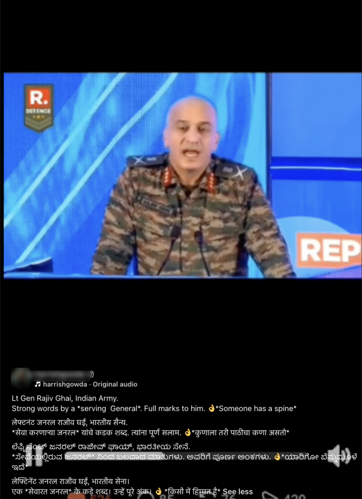 ಕ್ಲೇಮ್: ಈ ವಿಡಿಯೋದಲ್ಲಿ ಉಪ ಸೇನಾ ಮುಖ್ಯಸ್ಥರಾದ ಲೆಫ್ಟಿನೆಂಟ್ ಜನರಲ್ ರಾಜೀವ್ ಘಾಯಿಯವರು, ಭಾರತೀಯ ಸೇನೆಯಲ್ಲಿ ಹೆಚ್ಚುತ್ತಿರುವ ಕೇಸರಿ ರಾಜಕಾರಣ ಮತ್ತು ಧಾರ್ಮಿಕ ಧ್ರುವೀಕರಣದ ಪ್ರಭಾವವನ್ನು ಟೀಕಿಸಿದ್ದಾರೆ ಎಂದು ತೋರಿಸುತ್ತದೆ.