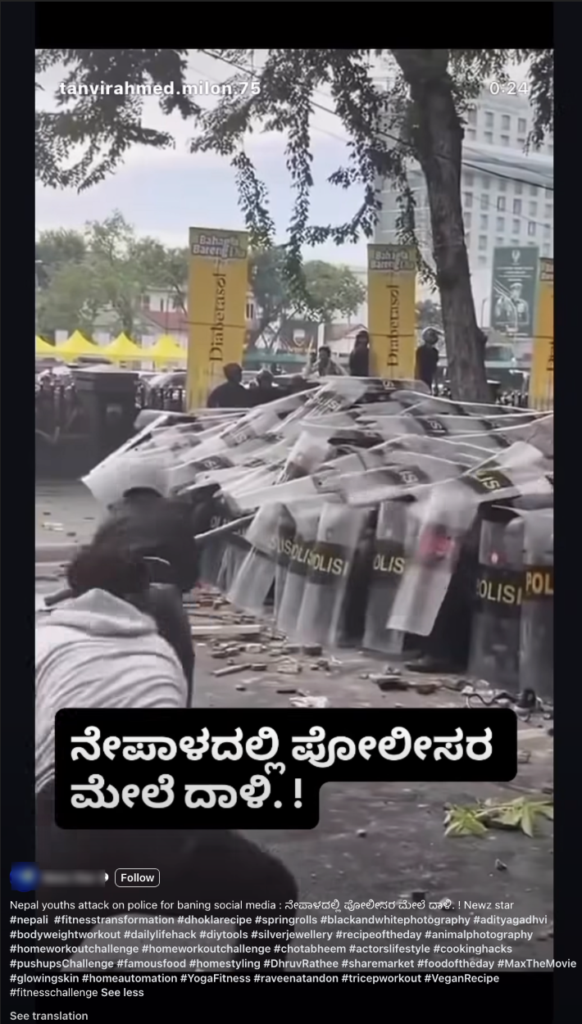 ವೈರಲ್ ವೀಡಿಯೊದಲ್ಲಿ ಗಲಭೆ ಗುರಾಣಿಗಳ ಮೇಲೆ ಬರೆಯಲಾದ ‘POLISI’ ಪದವನ್ನು ನಾವು ಮೊದಲು ಗಮನಿಸಿದ್ದೇವೆ ಮತ್ತು ಅದು ‘ಪೊಲೀಸ್‘ ಪದದ ಇಂಡೋನೇಷಿಯನ್ ಅನುವಾದ ಎಂದು ಗುರುತಿಸಿದ್ದೇವೆ. ನಂತರ ನಾವು ವೀಡಿಯೊದ ರಿವರ್ಸ್ ಇಮೇಜ್ ಹುಡುಕಾಟವನ್ನು ನಡೆಸಿದ್ದೇವೆ ಮತ್ತು ಅದೇ ದೃಶ್ಯಗಳನ್ನು ಆಗಸ್ಟ್ 2025 ರಲ್ಲಿ ಹಲವಾರು ಮಾಧ್ಯಮಗಳು (ಇಲ್ಲಿ, ಇಲ್ಲಿ ಮತ್ತು ಇಲ್ಲಿ) ಅಪ್ಲೋಡ್ ಮಾಡಿರುವುದನ್ನು ಕಂಡುಕೊಂಡಿದ್ದೇವೆ.