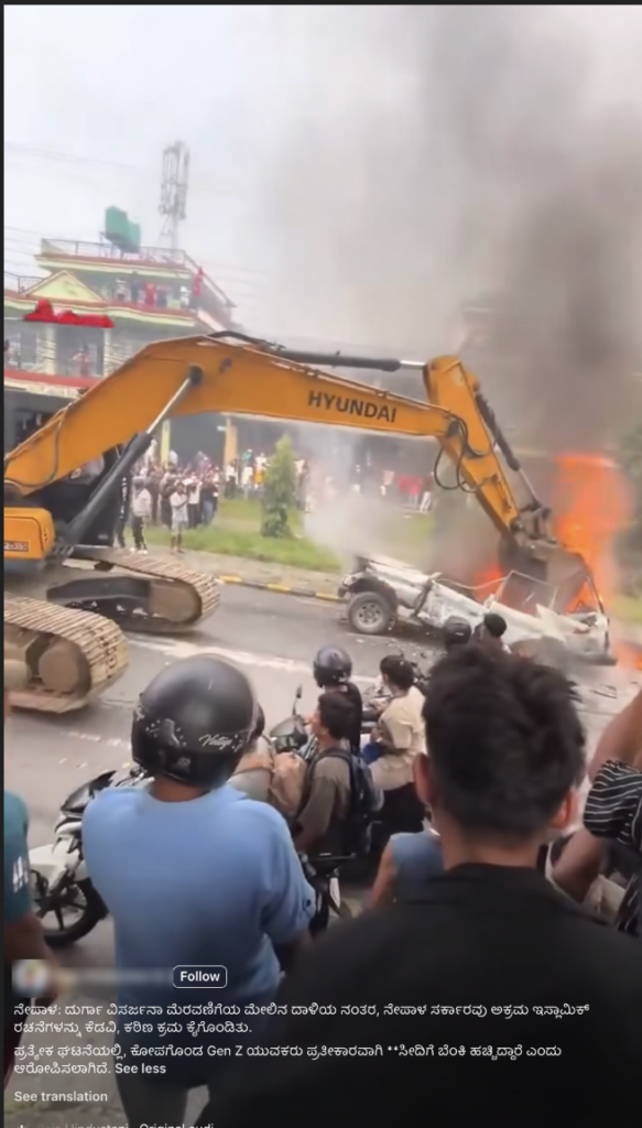 ಒಟ್ಟಾರೆಯಾಗಿ ಹೇಳುವುದಾದರೆ, ನೇಪಾಳದಲ್ಲಿ ನಡೆದ Gen-Z ಪ್ರತಿಭಟನೆಗಳ ವೀಡಿಯೊವನ್ನು, ದುರ್ಗಾ ಮಾತಾ ಮೆರವಣಿಗೆಯ ದಾಳಿಯ ನಂತರ ನೇಪಾಳ ಸರ್ಕಾರವು ಮುಸ್ಲಿಂ ಆಸ್ತಿಗಳನ್ನು ಬುಲ್ಡೋಜರ್ನಿಂದ ಕೆಡವುತ್ತಿದೆ ಎಂದು ತಪ್ಪಾಗಿ ಹಂಚಿಕೊಳ್ಳಲಾಗಿದೆ.