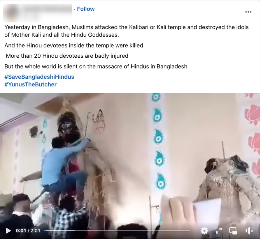 ಬಾಂಗ್ಲಾದೇಶದಲ್ಲಿ ಹಿಂದೂಗಳು ಮತ್ತು ಇತರ ಅಲ್ಪಸಂಖ್ಯಾತರ ವಿರುದ್ಧದ ಹಿಂಸಾಚಾರದ ವರದಿಗಳ ನಡುವೆ (ಇಲ್ಲಿ ಮತ್ತು ಇಲ್ಲಿ) ಅವರ ಧಾರ್ಮಿಕ ಸ್ಥಳಗಳ ಮೇಲಿನ ದಾಳಿಗಳು ಸೇರಿದಂತೆ, ಜನರು ಕಾಳಿ ದೇವಿಯ ವಿಗ್ರಹದ ತಲೆಯನ್ನು ತೆಗೆದಿರುವ ವೀಡಿಯೊವನ್ನು (ಇಲ್ಲಿ) ಸಾಮಾಜಿಕವಾಗಿ ವ್ಯಾಪಕವಾಗಿ ಹಂಚಿಕೊಳ್ಳಲಾಗಿದೆ. ಬಾಂಗ್ಲಾದೇಶದಲ್ಲಿ ಮುಸ್ಲಿಮರು ಹಿಂದೂ ದೇವಿಯ ವಿಗ್ರಹವನ್ನು ಧ್ವಂಸಗೊಳಿಸುವುದನ್ನು ಇದು ಚಿತ್ರಿಸುತ್ತದೆ ಎಂಬ ಹೇಳಿಕೆಯೊಂದಿಗೆ ಪೋಸ್ಟ್ ಅನ್ನು ಹಂಚಿಕೊಳ್ಳಲಾಗಿದೆ. ಹಾಗಾದರೆ ಈ ಪೋಸ್ಟ್ನಲ್ಲಿ ಮಾಡಿದ ಕ್ಲೈಮ್ ಅನ್ನು ಪರಿಶೀಲಿಸೋಣ.