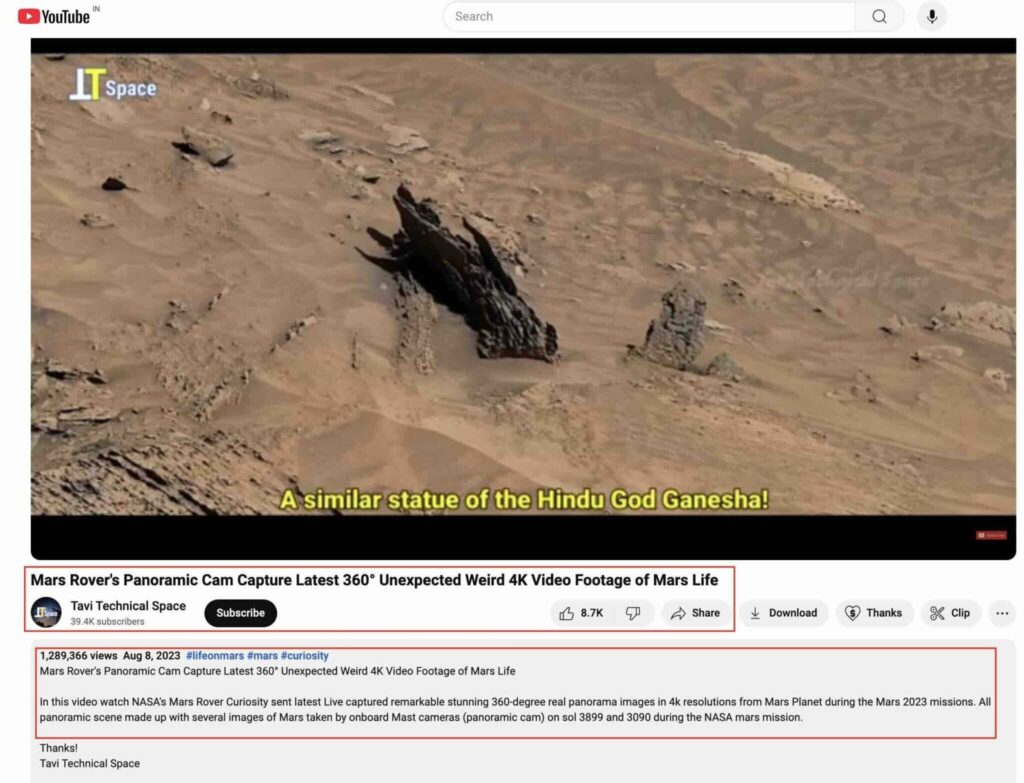 Subsequently, to gather more details about the viral video, we conducted a Google reverse image search using keyframes from the viral video. This search led us to an extended version of the video clip on a YouTube channel called ‘Tavi Technical Space’. The video (archived link) was uploaded on 8 August 2023 with the title: “Mars Rover’s Panoramic Cam Captures Latest 360° Unexpected Weird 4K Video Footage of Mars Life”. According to the video description, “This video is made up with several 4K resolution images of Mars taken by NASA’s Mars Curiosity rover onboard Mast cameras (panoramic cam) on sol 3899 and 3090 during the NASA 2023 mars mission.”