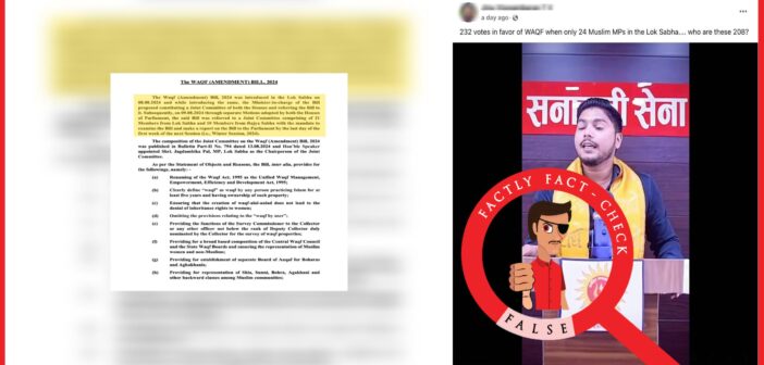 A video going viral on social media (here, here, and here) shows a man claiming that 232 votes were cast in support of the Waqf Board the Lok Sabha, despite there being only 24 Muslim MPs, and that 208 Hindu MPs voting in favour of the Waqf board. Let’s verify the claim through this article.