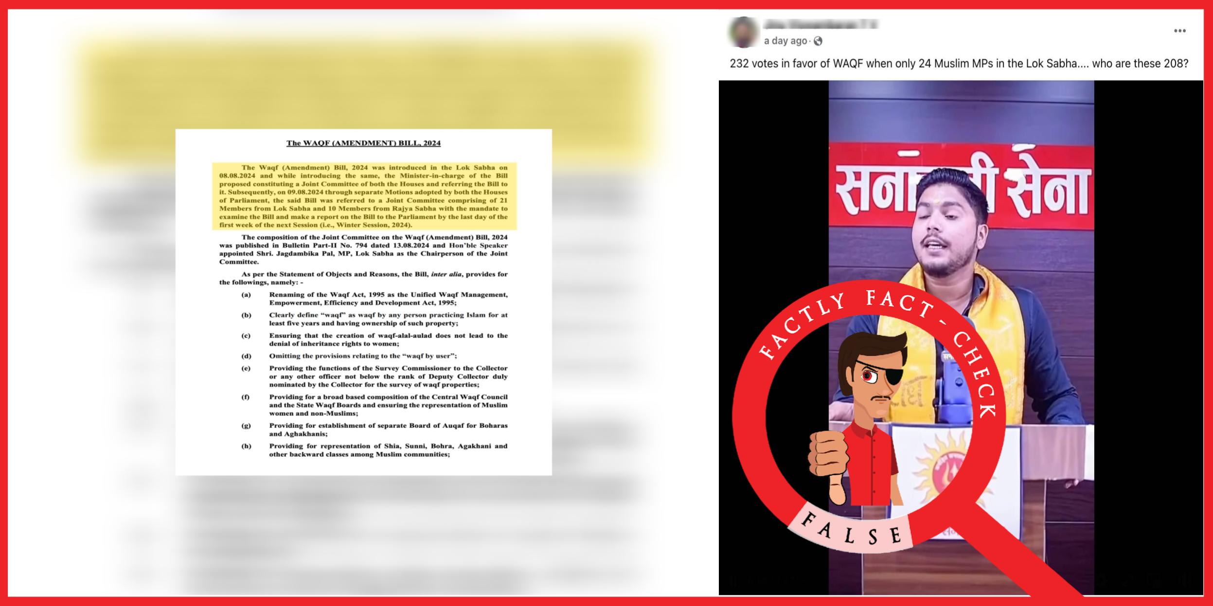Claim: 232 votes were cast in favour of Waqf Board in the Lok Sabha while there were only 24 Muslim MPs, implying 208 Hindu MPs voted in favour.