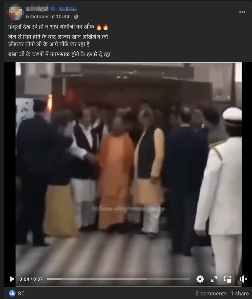 A video circulating online claims to show Samajwadi Party (SP) leader Azam Khan meeting with Chief Minister Yogi Adityanath immediately after his release from prison. He was released from the Sitapur jail on 23 September 2025 after spending nearly 23 months behind bars (here, here, and here). We fact-check this claim through this article.