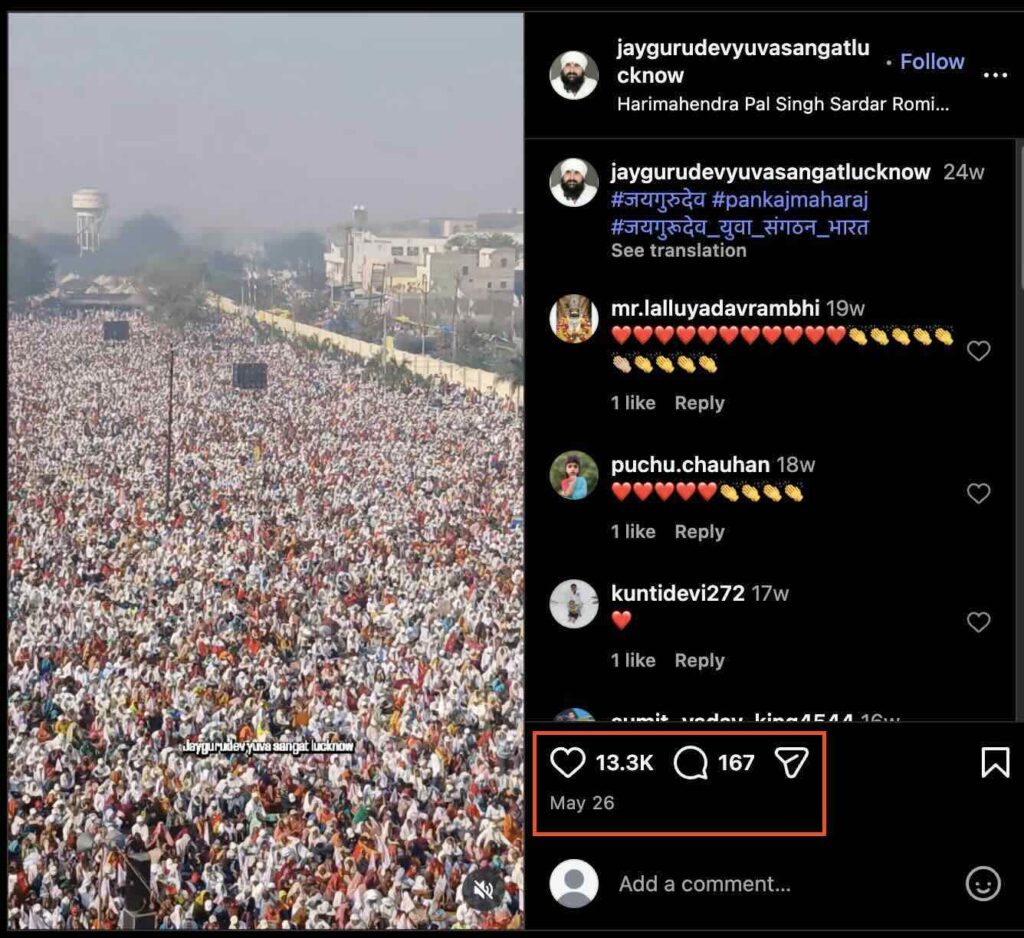 To verify the claim, we performed a keyword search using the watermark visible in the viral video “Jaygurudev Yuva Sangat Lucknow.” This led us to the Instagram page of the same organisation, where we found the identical video posted on 26 May 2025, several months before the Sanatan Hindu Ekta Padyatra began on 7 November 2025.