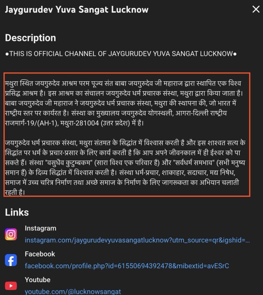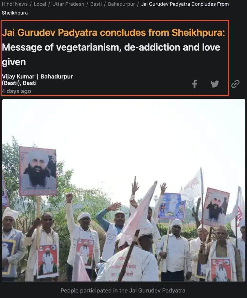To learn more about the Jaygurudev Yuva Sangat in Lucknow, we conducted an internet search using relevant keywords. This search led us to media reports (here, here, and here) about this organisation and a recent report published by Dainik Bhaskar on a Padyatra conducted by the Jaygurudev Yuva Sangat.