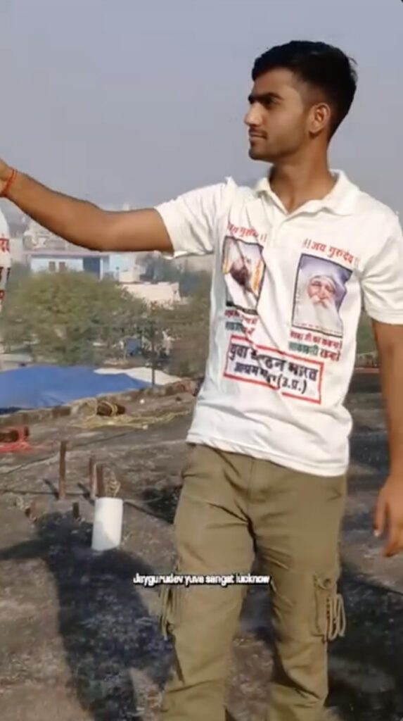 Furthermore, upon careful observation of this video, we found that a few men in the video were wearing T-shirts with the words “जय गुरुदेव’ and युवा संगठन भारत, आश्रम मथुरा (उ. प्र.)” printed on them, clearly linking the clip to Jay Gurudev’s event.